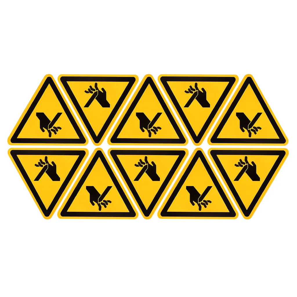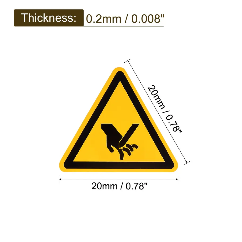 What is this? Small-sized triangle Anti Cutting Hand Warning Sign to indicate the danger of Machine What will I get? Length: 20mm/0.78inch;Thickness:0.2mm/0.008inch Pack of 10 warning sign Is there any advantages of the product? Made of vinyl material, bright color printing, endurable and with waterproof surface, Suitable for both indoor and outdoor use How to use it? Self-adhesive, easy to use, just peel and stick What should I notice? Due to the light problem, there is a slight color difference in the picture shooting