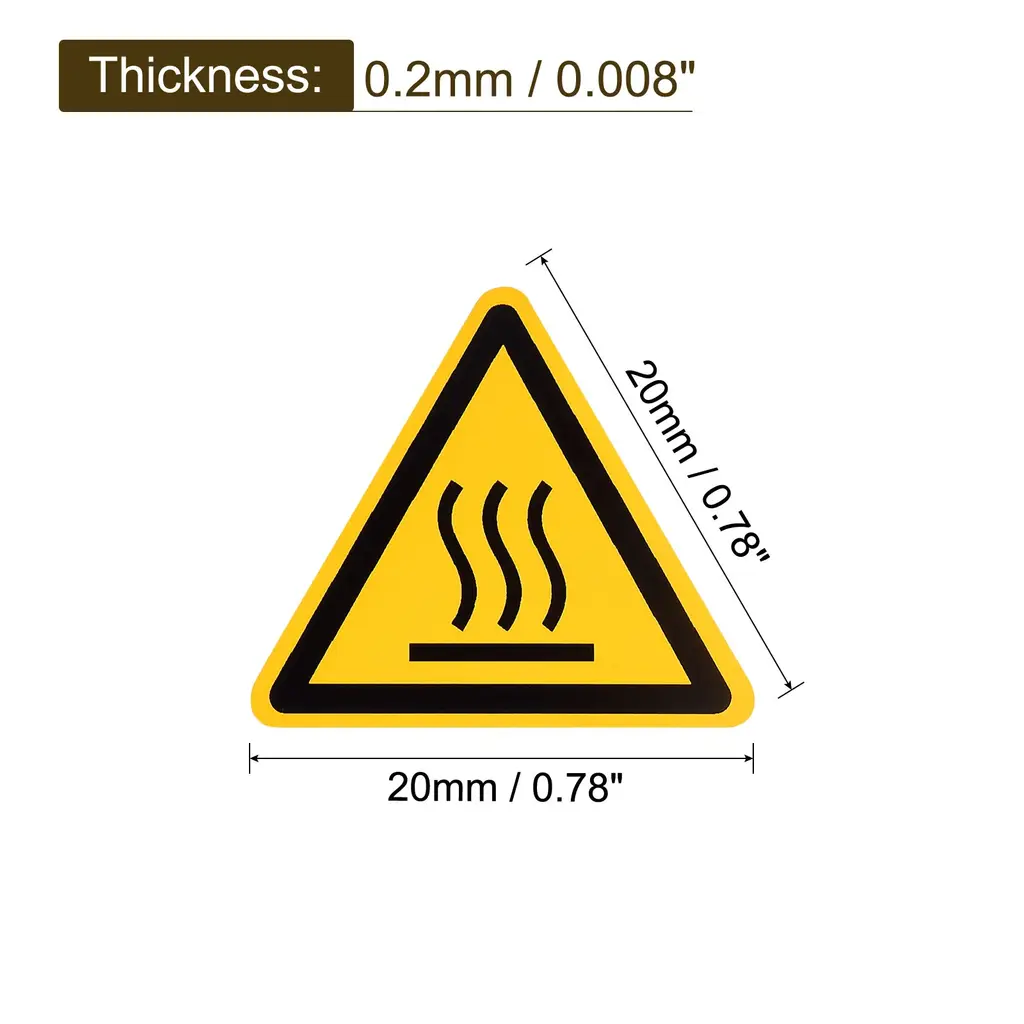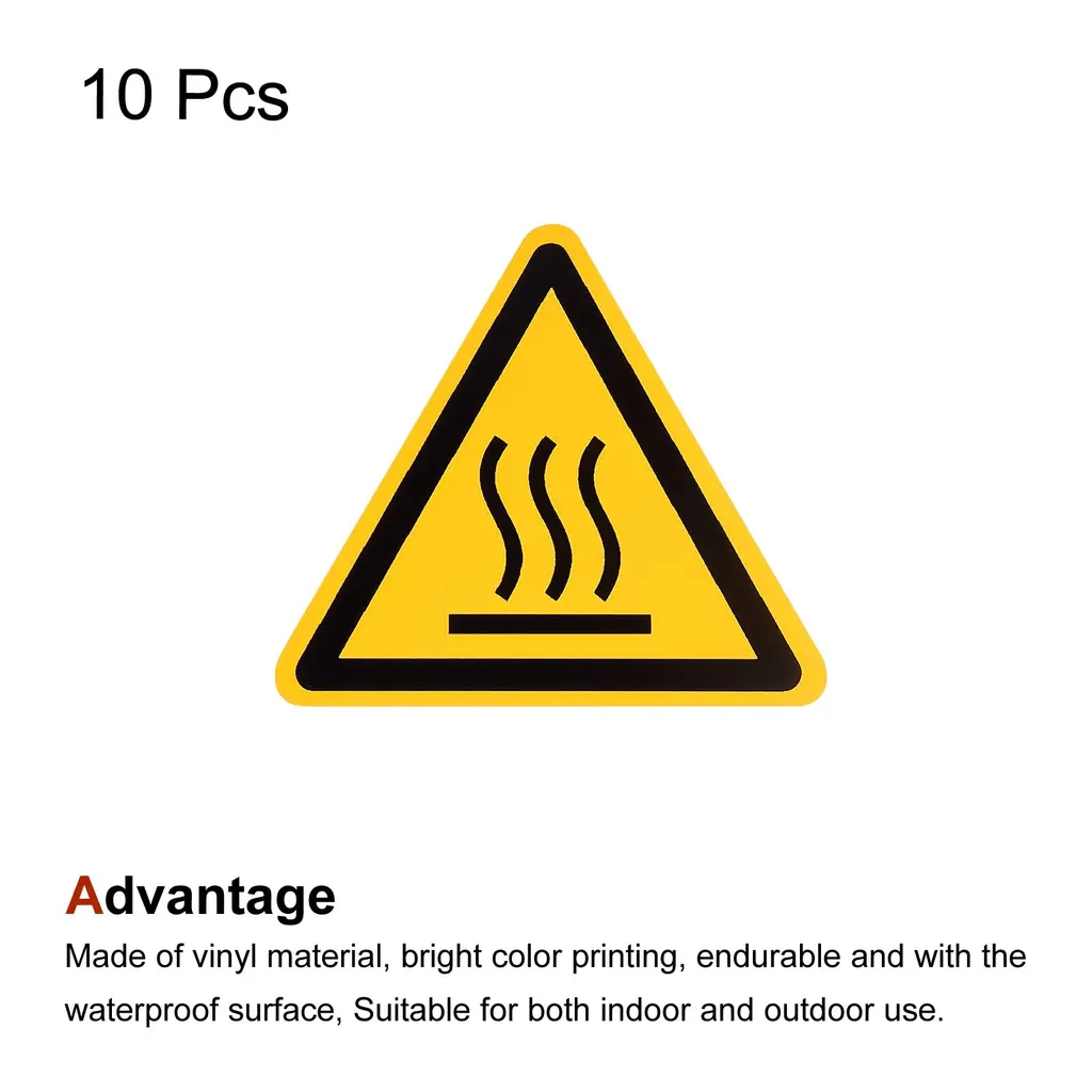 What is this? Small-sized high temperature warning sign to indicate the danger of high temperature on Surface What will I get? Length: 20mm/0.78inch;Thickness:0.2mm/0.008inch Pack of 10 warning sign Is there any advantages of the product? Made of vinyl material, bright color printing, endurable and with waterproof surface, Suitable for both indoor and outdoor use How to use it? Self-adhesive, easy to use, just peel and stick What should I notice? Due to the light problem, there is a slight color difference in the picture shooting