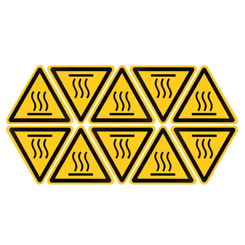 What is this? Small-sized high temperature warning sign to indicate the danger of high temperature on Surface What will I get? Length: 20mm/0.78inch;Thickness:0.2mm/0.008inch Pack of 10 warning sign Is there any advantages of the product? Made of vinyl material, bright color printing, endurable and with waterproof surface, Suitable for both indoor and outdoor use How to use it? Self-adhesive, easy to use, just peel and stick What should I notice? Due to the light problem, there is a slight color difference in the picture shooting