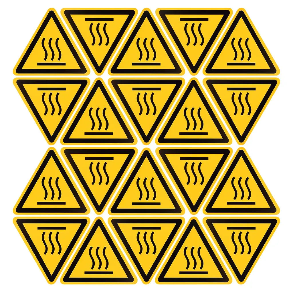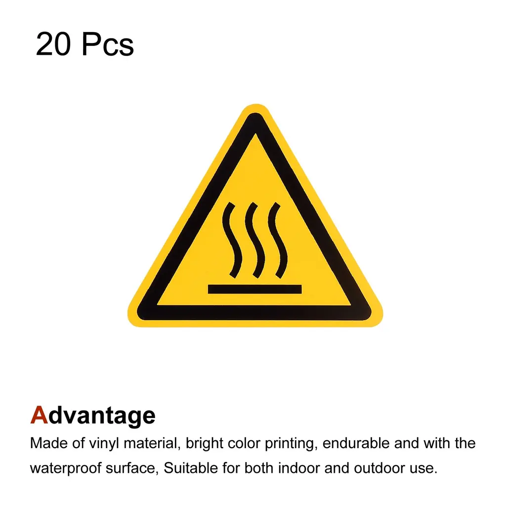 What is this? Small-sized high temperature warning sign to indicate the danger of high temperature on Surface What will I get? Length: 20mm/0.78inch;Thickness:0.2mm/0.008inch Pack of 20 warning sign Is there any advantages of the product? Made of vinyl material, bright color printing, endurable and with waterproof surface, Suitable for both indoor and outdoor use How to use it? Self-adhesive, easy to use, just peel and stick What should I notice? Due to the light problem, there is a slight color difference in the picture shooting