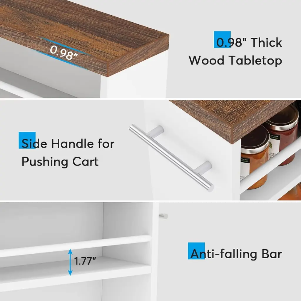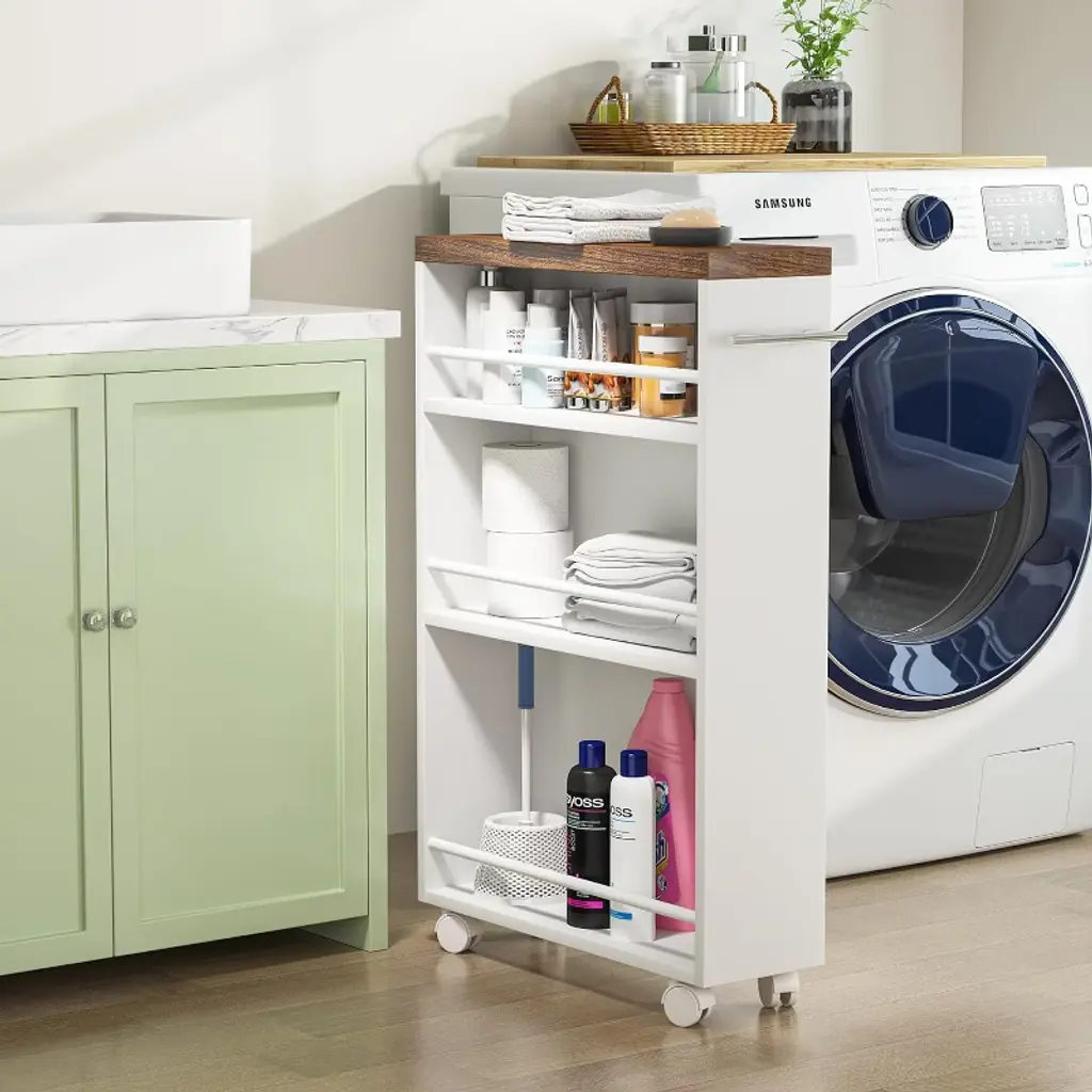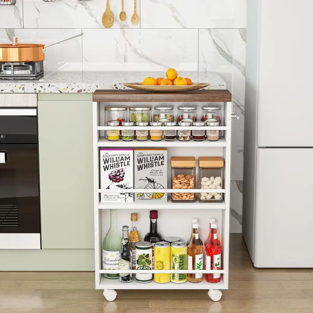 This slim storage cart will maximize your storage space even in the smallest spaces.6.3” width design is specially designed for narrow spaces. It can perfectly fit in the gap between the cabinet and fridge or any other tight spot to help organize your belongings conveniently and get rid of clutter. Equipped with a 3-tier open shelf and an added top, this narrow kitchen cart can accommodate all of your essentials with different heights easily to make your room neat and clean. The pull handle on the side and four 360 ° rolling casters make this free-standing slim rolling cart easy to move around without scratching your floor. At the same time, two caster wheels can be locked in place for secure use when it's stationary.