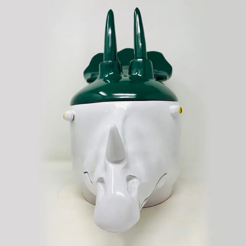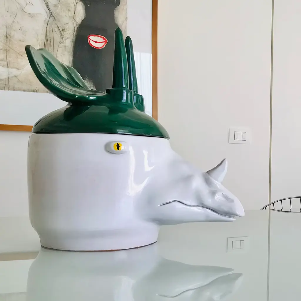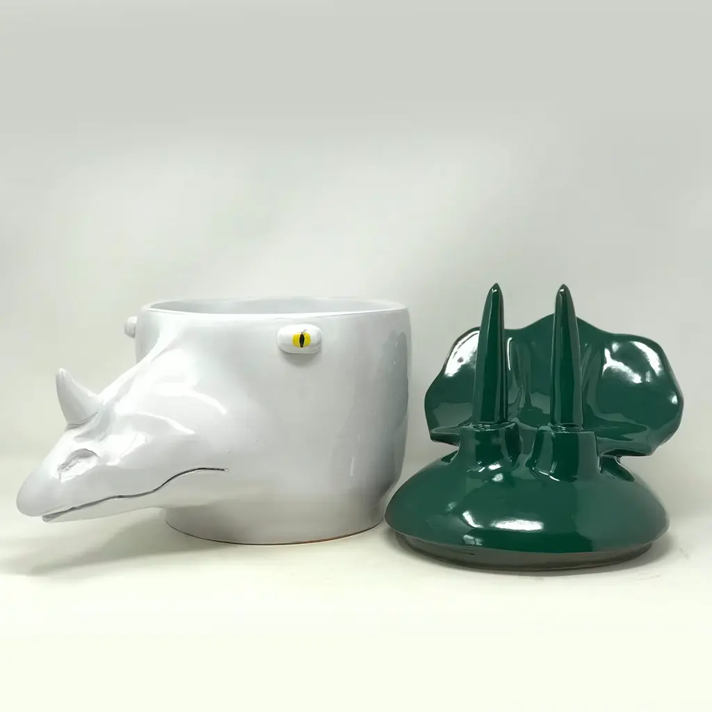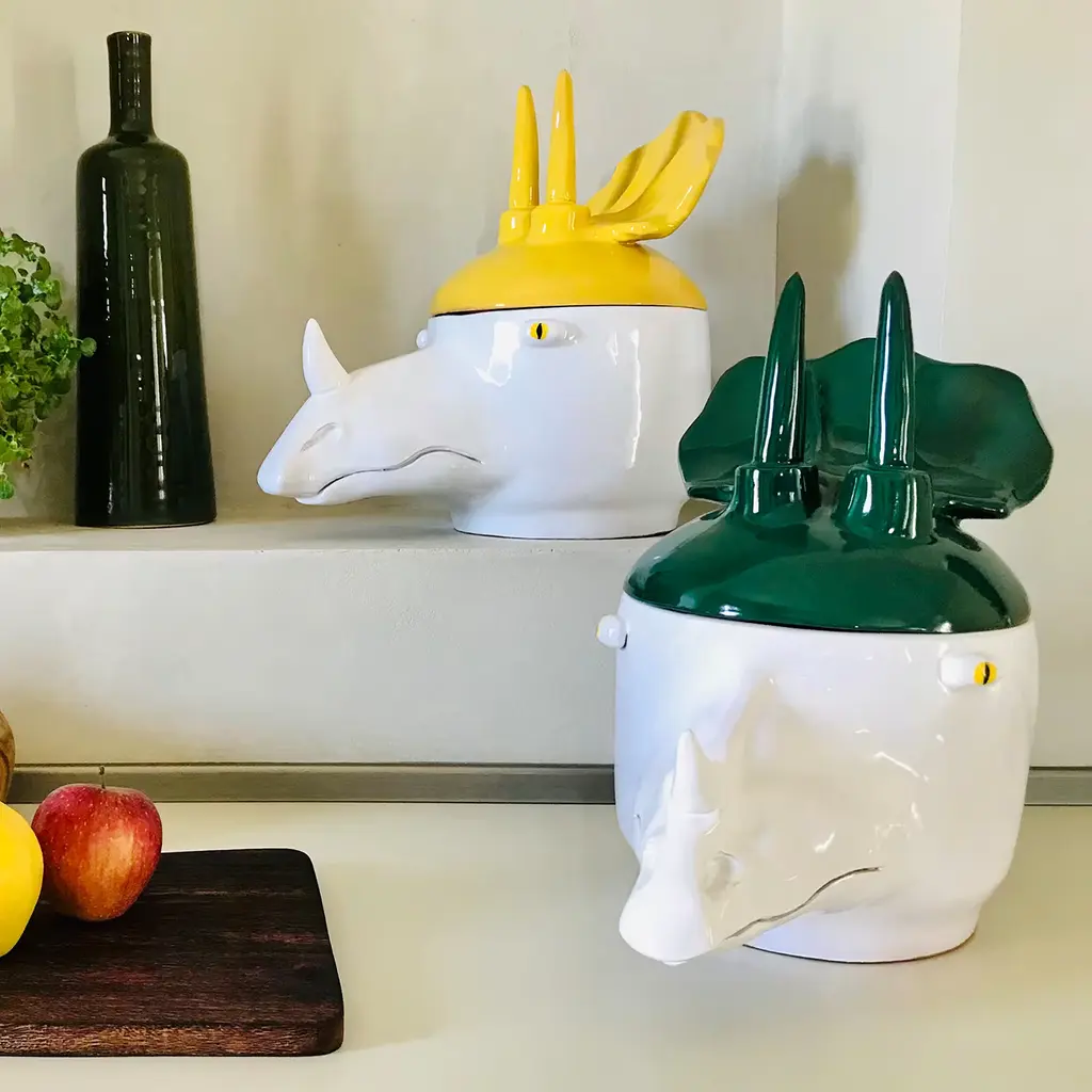 Collecting cookies or saving money for a dream trip reaches new levels of originality with this triceratops-shaped ceramic container. Deftly crafted by hand following the traditional coiling technique, it undergoes a first firing at 960° and a second one at 930° that seals the brightness of its glazes. The snout and face are glazed in white while the lid - including the antlers - is accented in shimmering green. Please ask the Concierge for other colors and a smaller variant.