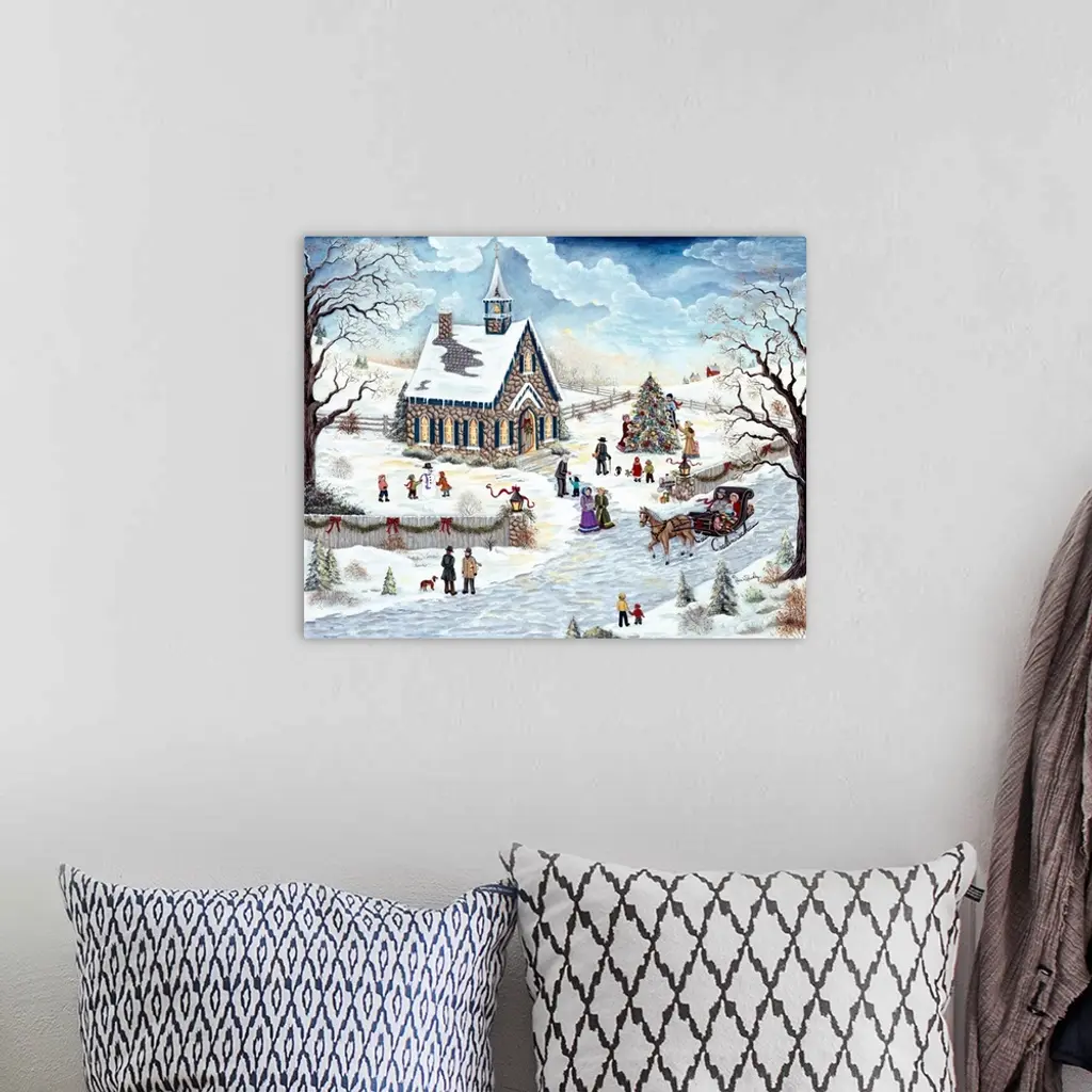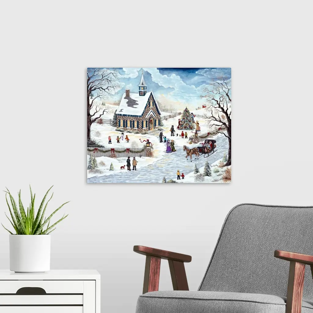 Village people out side of church decorating christmas tree riding in a carriage and building a snowman, Americana.
