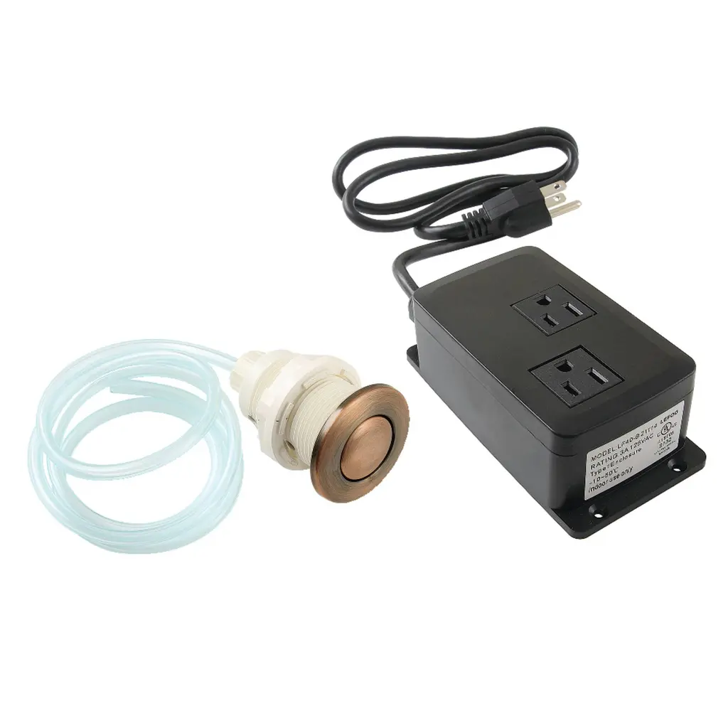 The disposal air switch button from Gourmetier is a convenient way in finishing work around the kitchen sink. The button, which can be mounted to the sink or the countertop, connects to a hose which plunges air activating the disposal. The stainless steel button cover is available in a multitude of finishes (Chrome, brass, bronze, nickel) to complement the finish of your faucet and/or surrounding decor. This air switch kit includes: air switch button, air tube, and dual outlet power module.FeaturesSolid stainless steel and ABS constructionLow profile air switch gives you a safe way to operate your garbage disposalDual outlet gives you an extra outlet, not controlled by the air switch, perfect for additional appliances such as hot water dispenserInstalls on a standard 1-3/8" holeAir switch kit includes power module, air switch button, and air tubeAir switch can be installed in any convenient location such as cabinet front or on countertop within easy reach to persons with disabilitiesAll mounting hardware includedUL listed power modulePower Module Electrical Rating: 3A, 125VACFor indoor use only