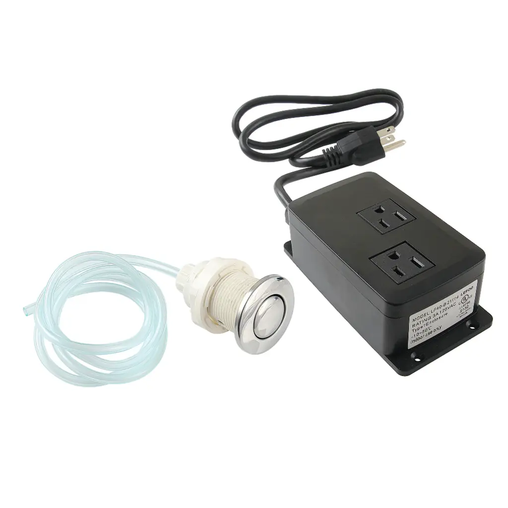The disposal air switch button from Gourmetier is a convenient way in finishing work around the kitchen sink. The button, which can be mounted to the sink or the countertop, connects to a hose which plunges air activating the disposal. The stainless steel button cover is available in a multitude of finishes (Chrome, brass, bronze, nickel) to complement the finish of your faucet and/or surrounding decor. This air switch kit includes: air switch button, air tube, and dual outlet power module.FeaturesSolid stainless steel and ABS constructionLow profile air switch gives you a safe way to operate your garbage disposalDual outlet gives you an extra outlet, not controlled by the air switch, perfect for additional appliances such as hot water dispenserInstalls on a standard 1-3/8" holeAir switch kit includes power module, air switch button, and air tubeAir switch can be installed in any convenient location such as cabinet front or on countertop within easy reach to persons with disabilitiesAll mounting hardware includedUL listed power modulePower Module Electrical Rating: 3A, 125VACFor indoor use only