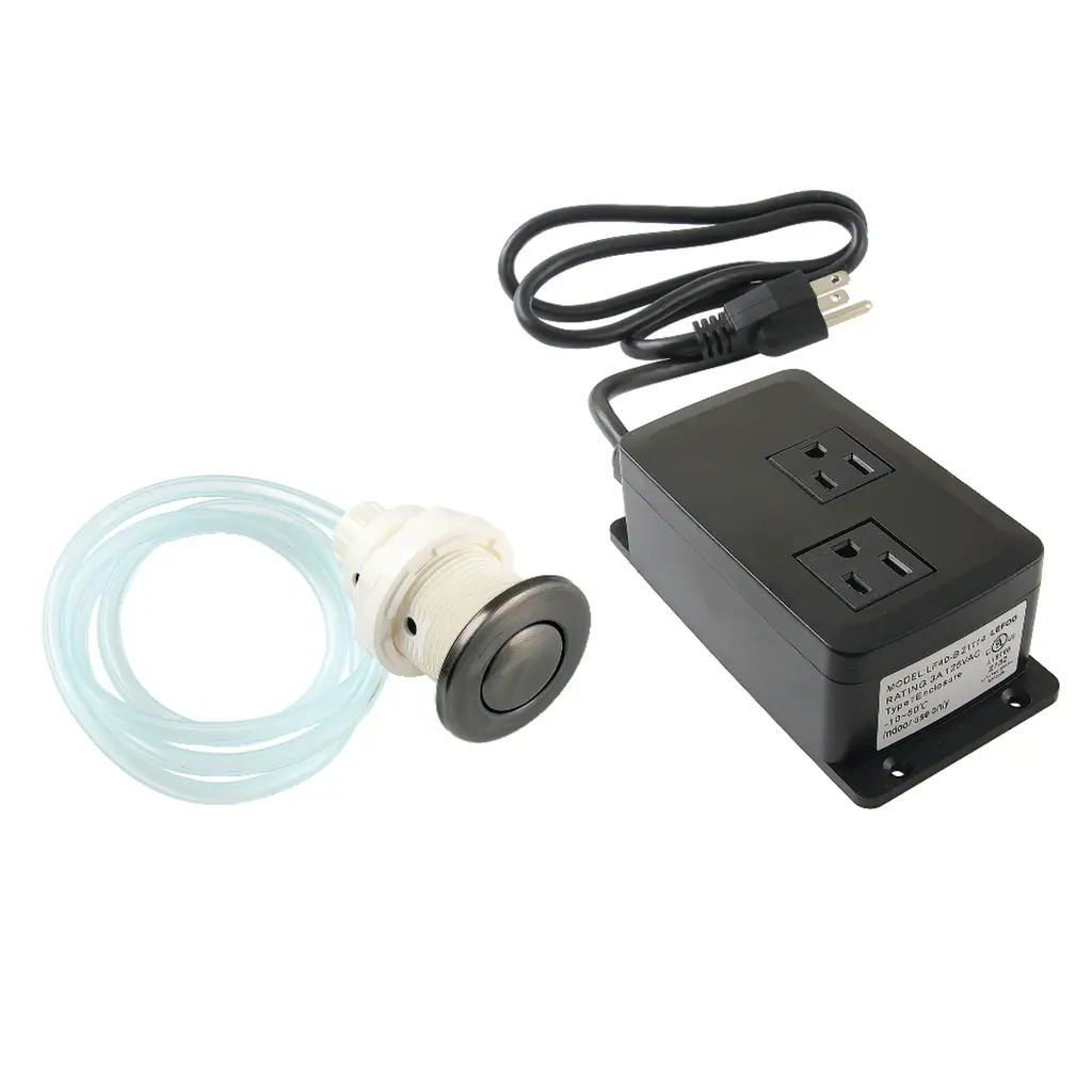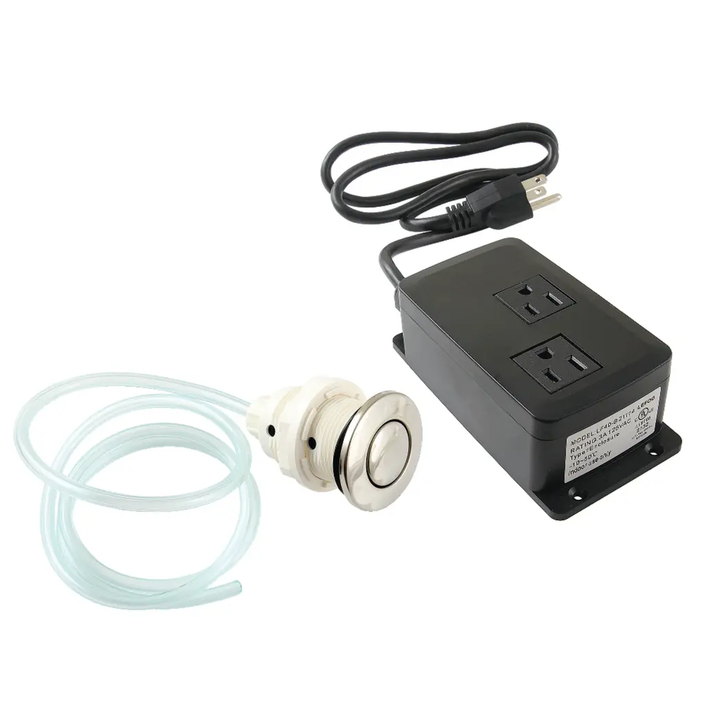 The disposal air switch button from Gourmetier is a convenient way in finishing work around the kitchen sink. The button, which can be mounted to the sink or the countertop, connects to a hose which plunges air activating the disposal. The stainless steel button cover is available in a multitude of finishes (Chrome, brass, bronze, nickel) to complement the finish of your faucet and/or surrounding decor. This air switch kit includes: air switch button, air tube, and dual outlet power module.FeaturesSolid stainless steel and ABS constructionLow profile air switch gives you a safe way to operate your garbage disposalDual outlet gives you an extra outlet, not controlled by the air switch, perfect for additional appliances such as hot water dispenserInstalls on a standard 1-3/8" holeAir switch kit includes power module, air switch button, and air tubeAir switch can be installed in any convenient location such as cabinet front or on countertop within easy reach to persons with disabilitiesAll mounting hardware includedUL listed power modulePower Module Electrical Rating: 3A, 125VACFor indoor use only