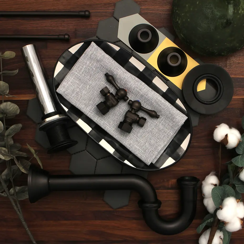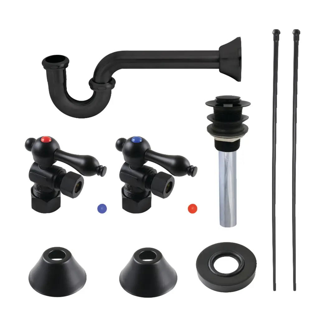 This traditional style vessel sink kit consists of all the necessary parts to set up a sound waste water drainage system. The parts included are single handle compression angle stops, 30" bullnose lavatory supply lines, 1/2" IPS bell flanges, a 1-1/4" P-trap, mounting ring and an 22-gauge Push-button drain without overflow hole. Constructed of high quality material and a tarnish-resistant finish, designed for long-lasting performance. Available in a variety of stunning finishes ready to match any home decor.FeaturesSolid brass constructionSupply and p-trap plumbing trim kit for bathroom sinksKit contains: 2 angle stops, 2 wall flanges, 2 supply lines, 1 p-trap, 1 p-trap wall flange, 1 drain, 1 mounting ringAngle stops designed to fit 1/2" (Nom) copper pipe (Compression fitting)Angle stop inlet is 5/8" O.D. compression (compression slip fit)Angle stop outlet is 3/8" O.D. compression (compression slip fit)Angle stops include traditional lever handleIncludes (2) 2-7/16" bell flanges to cover any unsightly holesTwo pieces 3/8" x 30" bull nose rigid supply linesOne traditional style p-trap with flangeP-trap is 1-1/4" diameter for bathroom sink drainsP-trap measures 12" from drain inlet center to wall-end