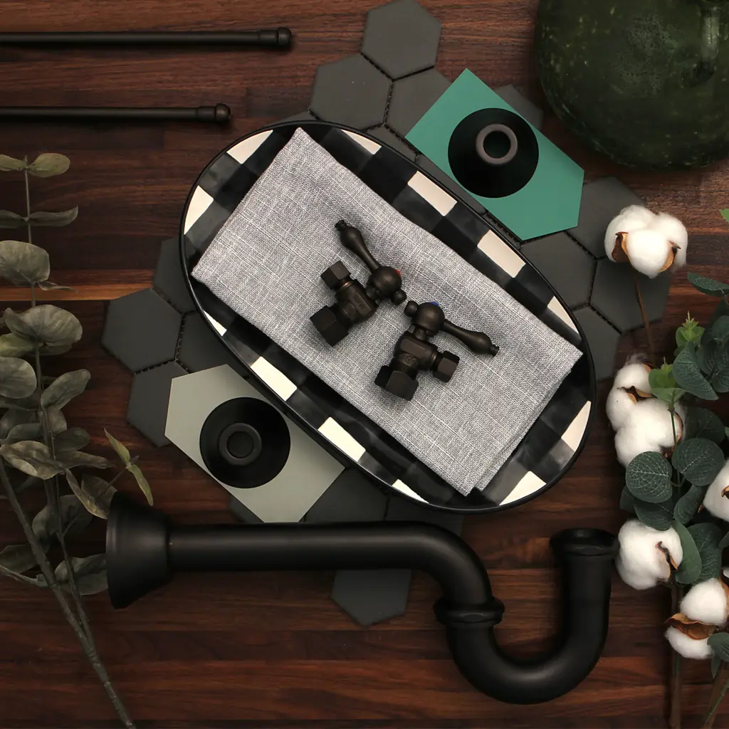 This lavatory/kitchen supply combo provides all the necessary components for installing a sink water draining system. The kit features stylish traditional designs and includes a number of items: Compression 1/4-turn angle stops , 30-inch bullnose lavatory supply lines, 1/2-inch bell flanges and a 1-1/4" P-trap. Constructed of high quality material and a tarnish-resistant finish, designed for long-lasting performance. Available in a variety of stunning finishes ready to match any home decor.FeaturesTwo 5/8" O.D. comp x 3/8" O.D. comp quarter turn angle stop valvesTwo high profile flangesTwo pieces 3/8" x 30" bull nose rigid supply linesOne traditional p-trap with flangeAngle stops include traditional lever handle