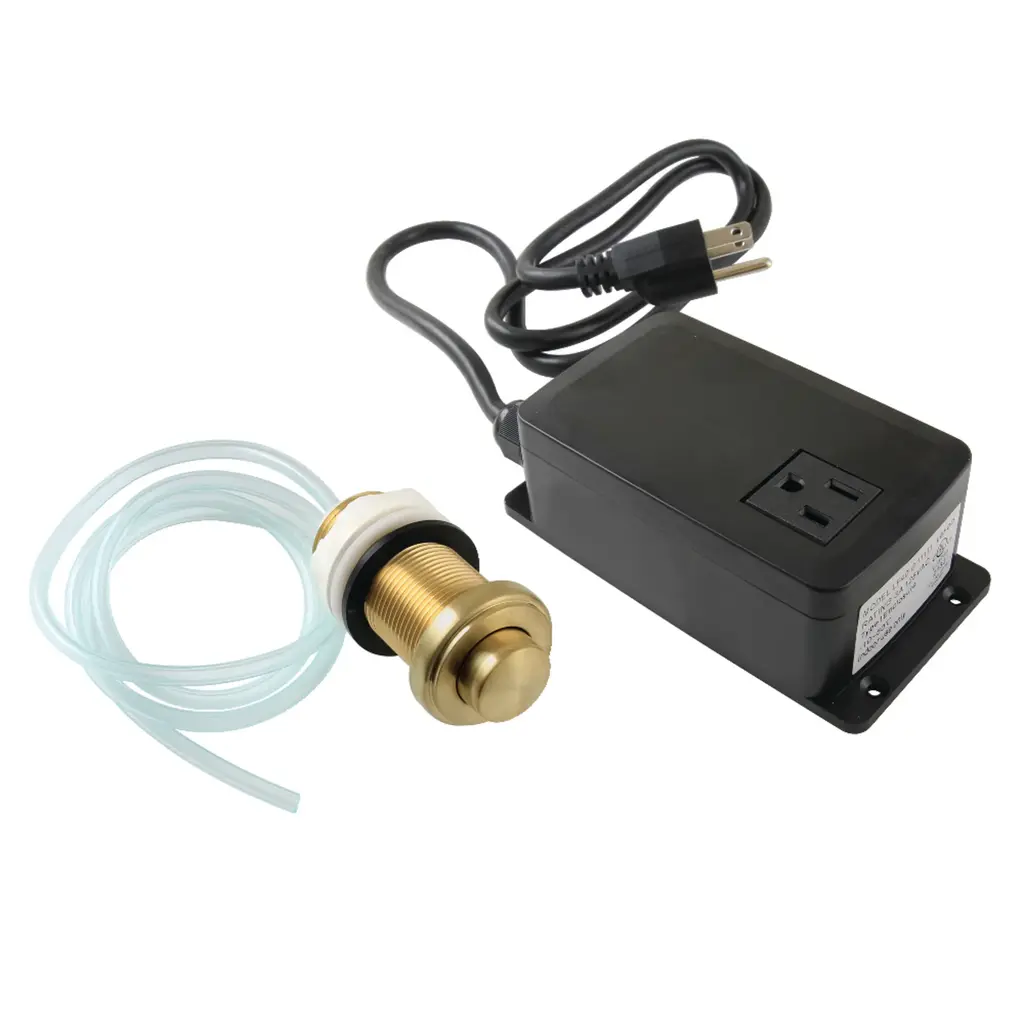 The disposal air switch button from Gourmetier is a convenient way in finishing work around the kitchen sink. The button, which can be mounted to the sink or the countertop, connects to a hose which plunges air activating the disposal. The brass button is available in a multitude of finishes (Chrome, brass, bronze, nickel) to complement the finish of your faucet and/or surrounding decor. This air switch kit includes: air switch button, air tube, and single outlet power module.FeaturesSolid stainless steel and ABS constructionAir switch gives you a safe way to operate your garbage disposalSingle outlet power module can be used to power your garbage disposal or any other applianceInstalls on a standard 1-3/8" holeAir switch kit includes power module, air switch button, and air tubeAir switch can be installed in any convenient location such as cabinet front or on countertop within easy reach to persons with disabilitiesAll mounting hardware includedUL listed power modulePower Module Electrical Rating: 3A, 125VACFor indoor use only