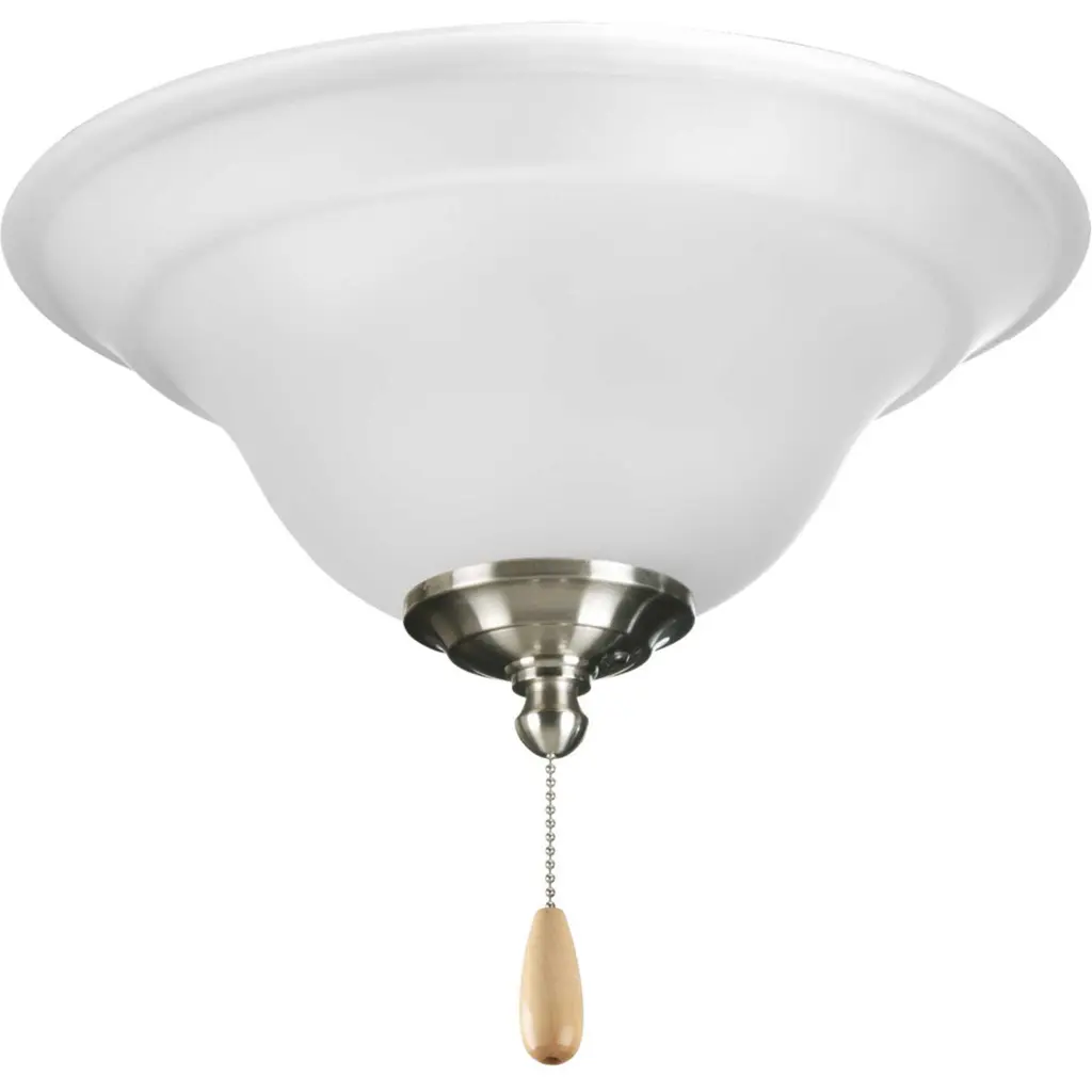 Two-light fan kit with an etched glass bowl from the Trinity Collection. Finials included are -09 Brushed Nickel, -20 Antique Bronze, -30 White and -77 Forged Bronze that match a variety of Progress Lighting fans. Quick-connect wiring makes it easy to install to a fan that accept an accessory light. Gracefully exotic, the Trinity Collection offers classic sophistication for interiors. Includes two 3000K, 800 lumen each (source), Title 24 certified LED bulbs.