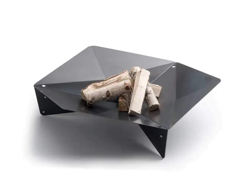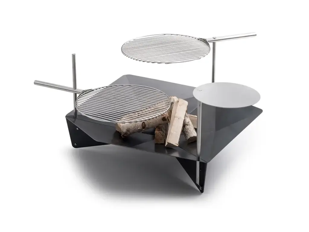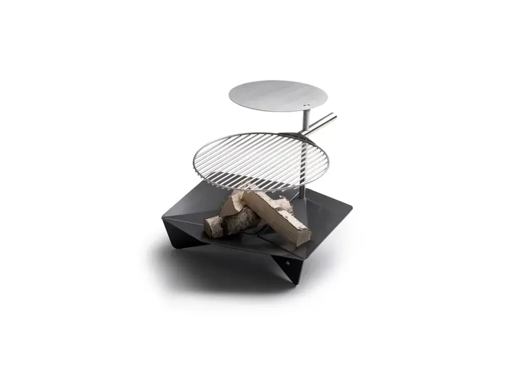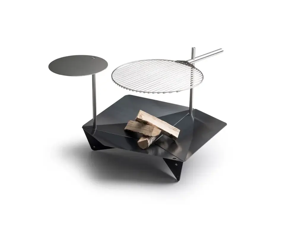 TRIPLE - a tribute to open fireplaces – the most original form of heat and cosiness. Designed in edged clarity and made of massive corten steel, the fire bowl series TRIPLE cultivates the archaic heat source through simple and thrilling functionality. With a few steps only, three identical segments – neverthe-less faceted in themselves – complete each other to form one solid, larger whole. Mobility and a resource-saving transport arise from its separability. The adaptable cooking grate can be continuously adjusted in height and is rotatable. On its surface, a teapot, mulled wine or grillables find place. It can moreover be rotated inwards in order to cook a spicy stew.// fireplace and grill// easy to disassemble, compact transport dimensions// corten steel – developing a living, unique rust patina// Varied accessories available - Please note: TRIPLE Ø 65 cm is only available with TRIPLE grid Ø 45 cm expandable
