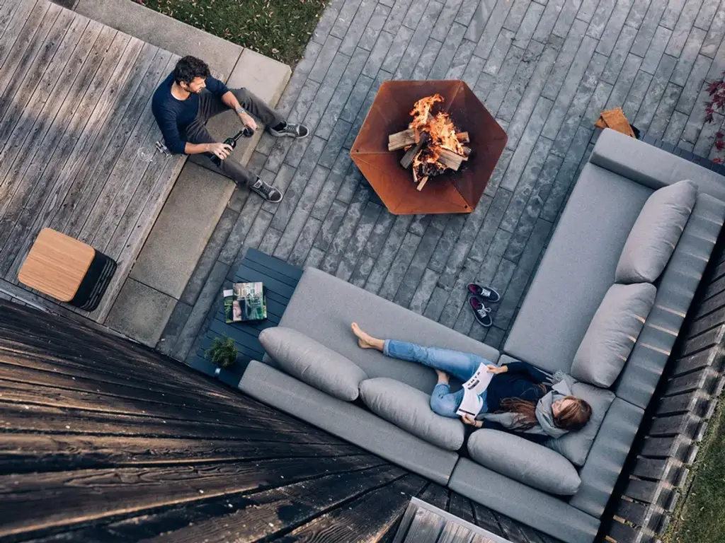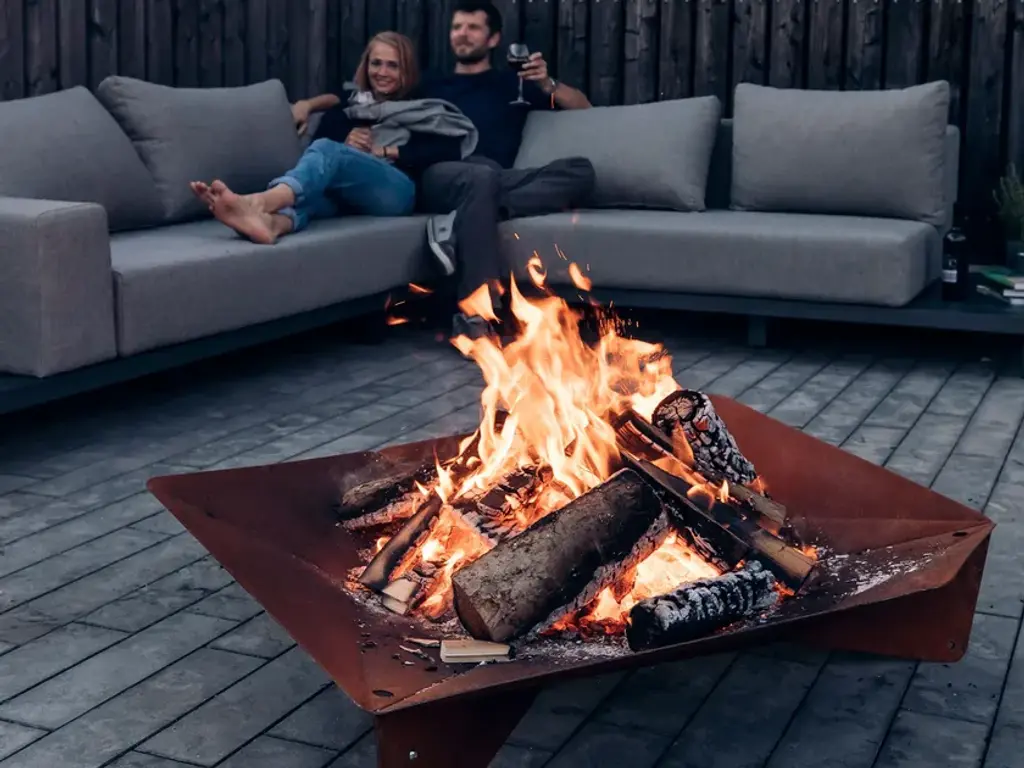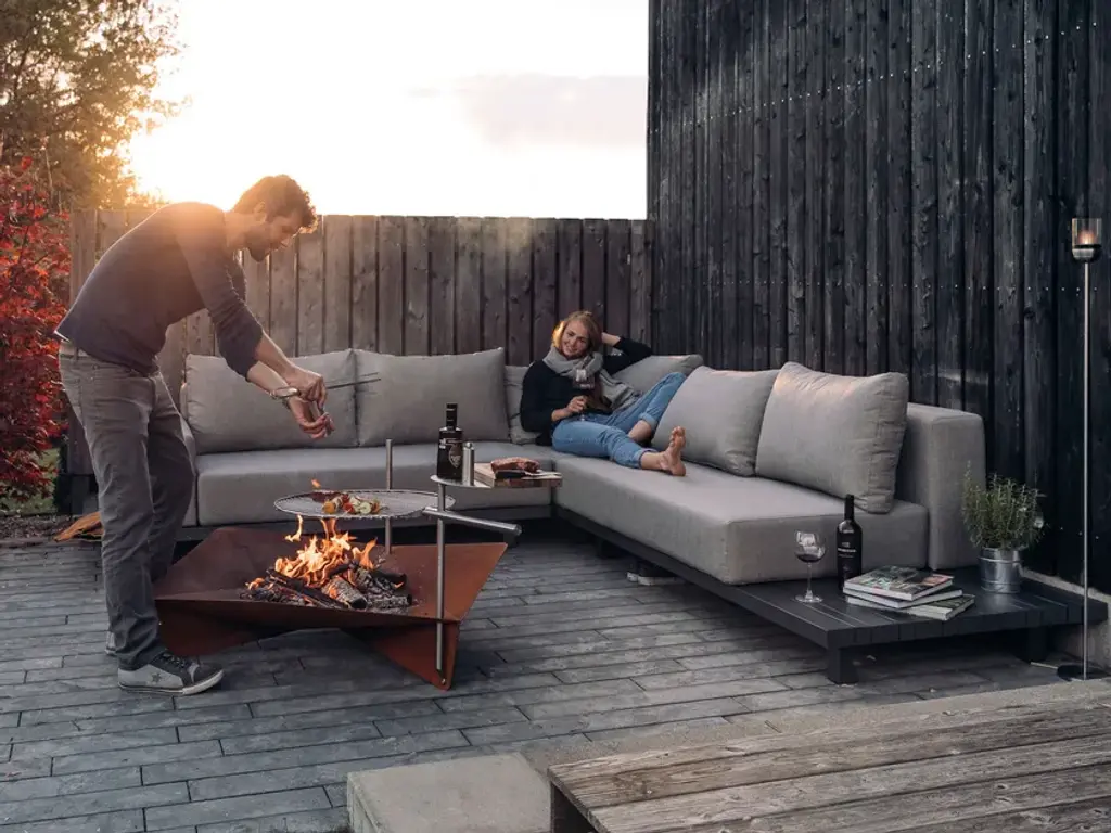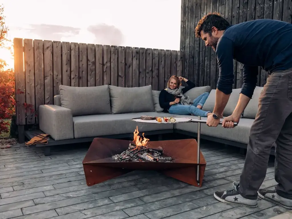 TRIPLE - a tribute to open fireplaces – the most original form of heat and cosiness. Designed in edged clarity and made of massive corten steel, the fire bowl series TRIPLE cultivates the archaic heat source through simple and thrilling functionality. With a few steps only, three identical segments – neverthe-less faceted in themselves – complete each other to form one solid, larger whole. Mobility and a resource-saving transport arise from its separability. The adaptable cooking grate can be continuously adjusted in height and is rotatable. On its surface, a teapot, mulled wine or grillables find place. It can moreover be rotated inwards in order to cook a spicy stew.// fireplace and grill// easy to disassemble, compact transport dimensions// corten steel – developing a living, unique rust patina// Varied accessories available - Please note: TRIPLE Ø 65 cm is only available with TRIPLE grid Ø 45 cm expandable