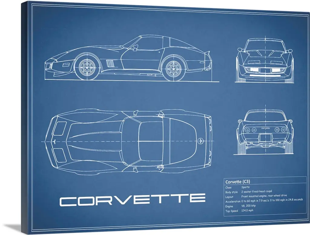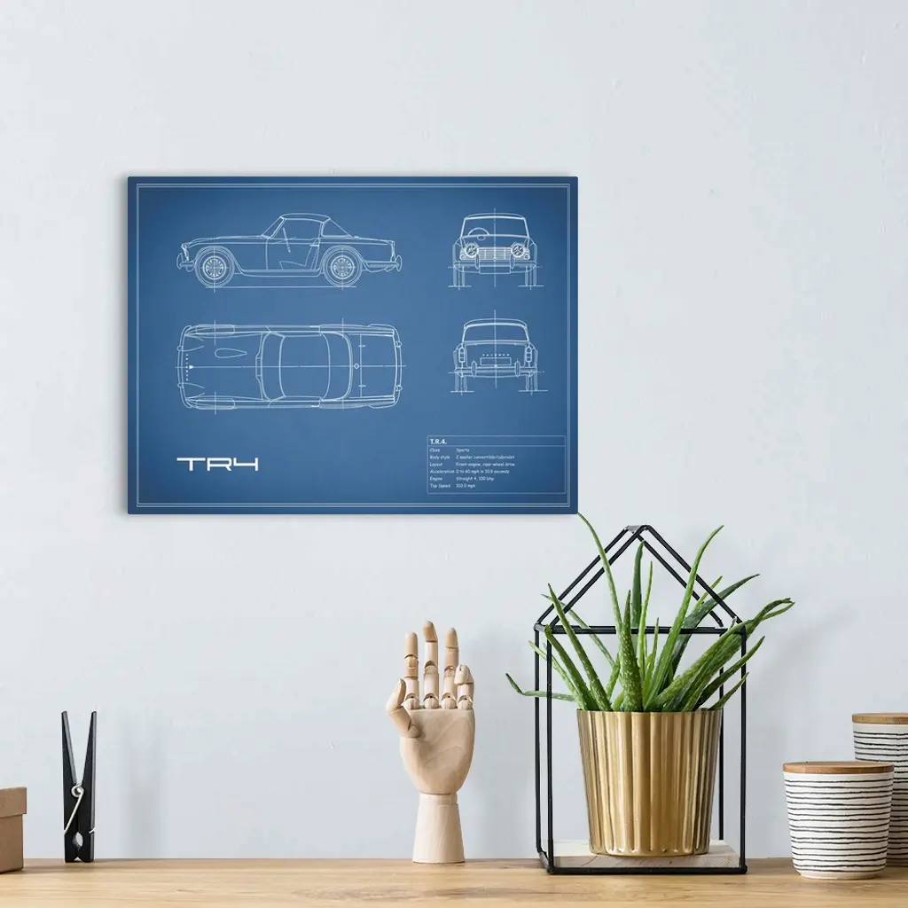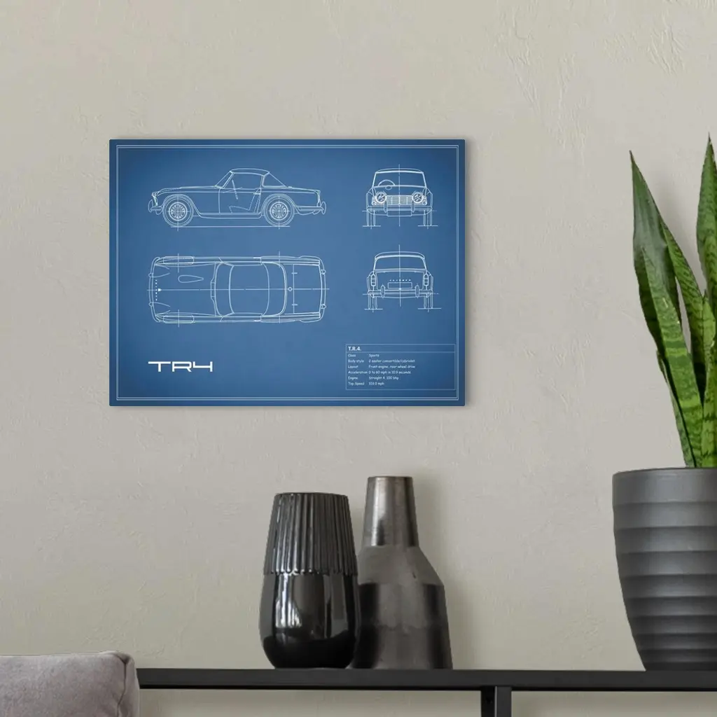 Antique style blueprint diagram of a Triumph TR4 printed on a Blue background