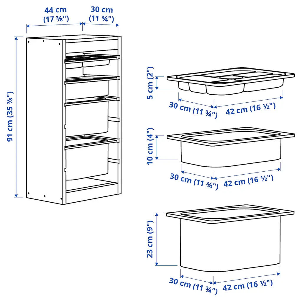 TROFAST Storage combination with boxes/tray - light white stained pine gray/white 17 3/8x11 3/4x35 7/8 ". A playful and sturdy storage series for storing and organizing toys. If you want to protect the contents from dust and dirt, you can complete with TROFAST lid, sold separately.