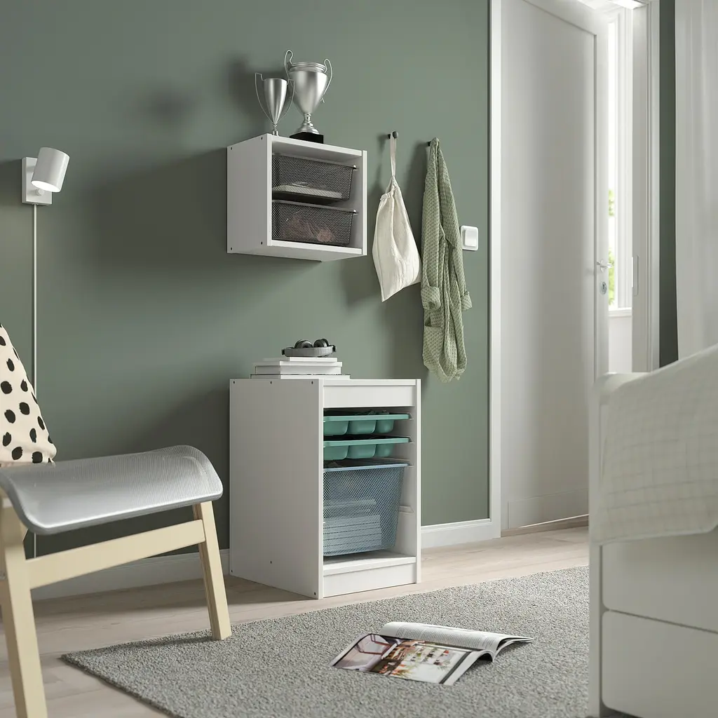 TROFAST Storage combination with box/trays - white turquoise/gray-blue 13 3/8x17 3/8x22 ". This sturdy and spacious storage solution makes it easier for your child to organize and keep everything in order. Recommended for indoor use only. Not approved for food contact. Guide rails included.