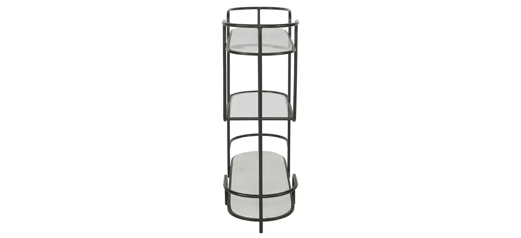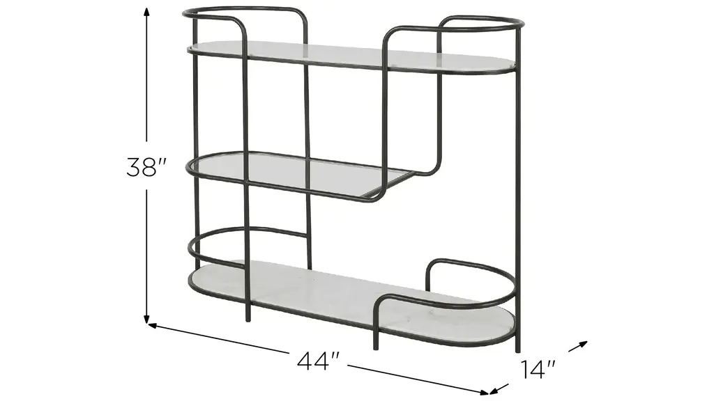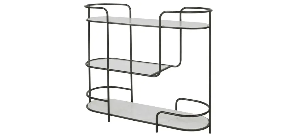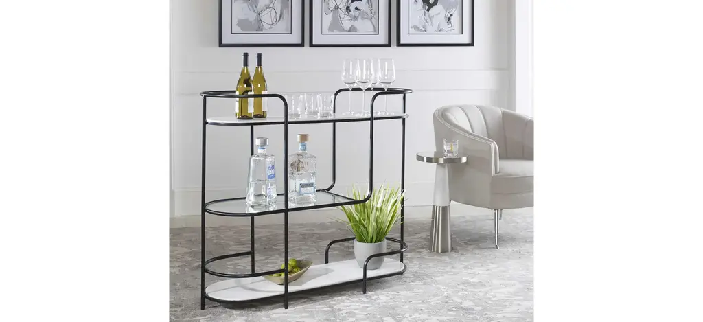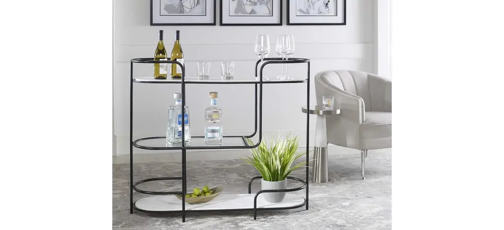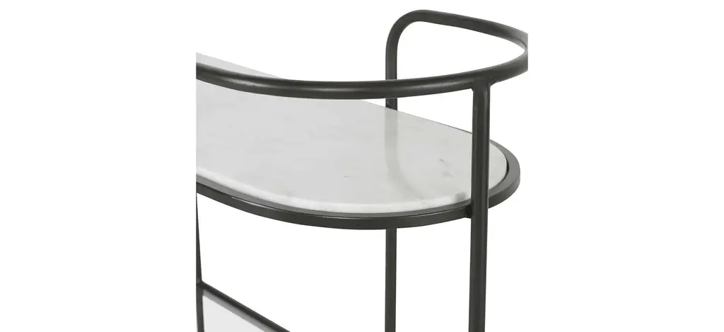 Trolley Bar Console, inspired by a mix of classic mod design and contemporary styling, this multifunctional piece can serve as a bar, server, or console table. the curved iron frame is finished in satin black, accented by white marble and tempered glass shelving. Because of the natural characteristics of marble, each piece will have unique veining patterns.