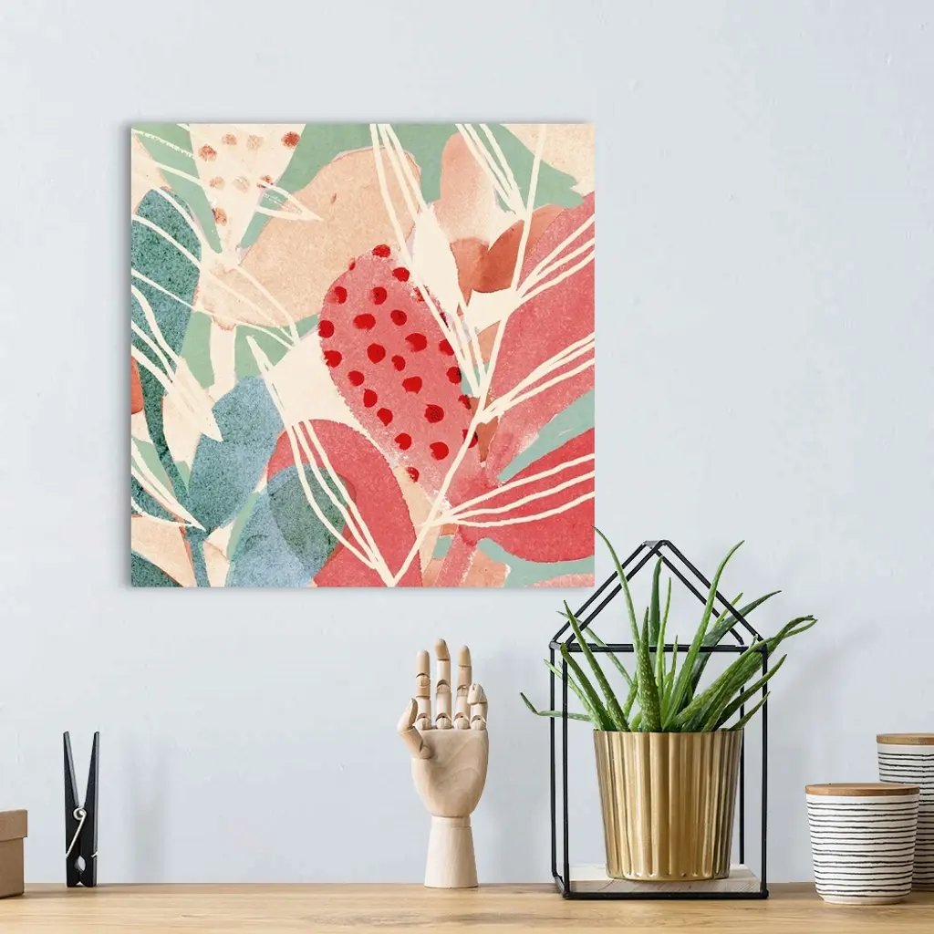 An assortment of tropical foliage in pink and blue-green hues arranged in a cluster.