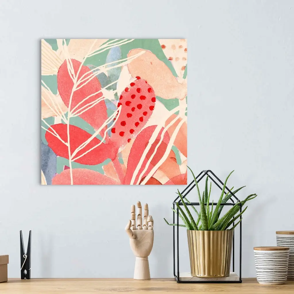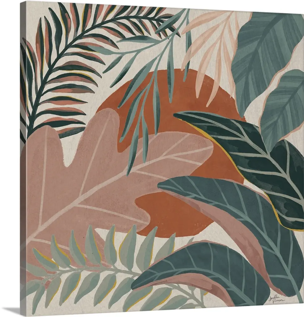 An assortment of tropical foliage in pink and blue-green hues arranged in a cluster.