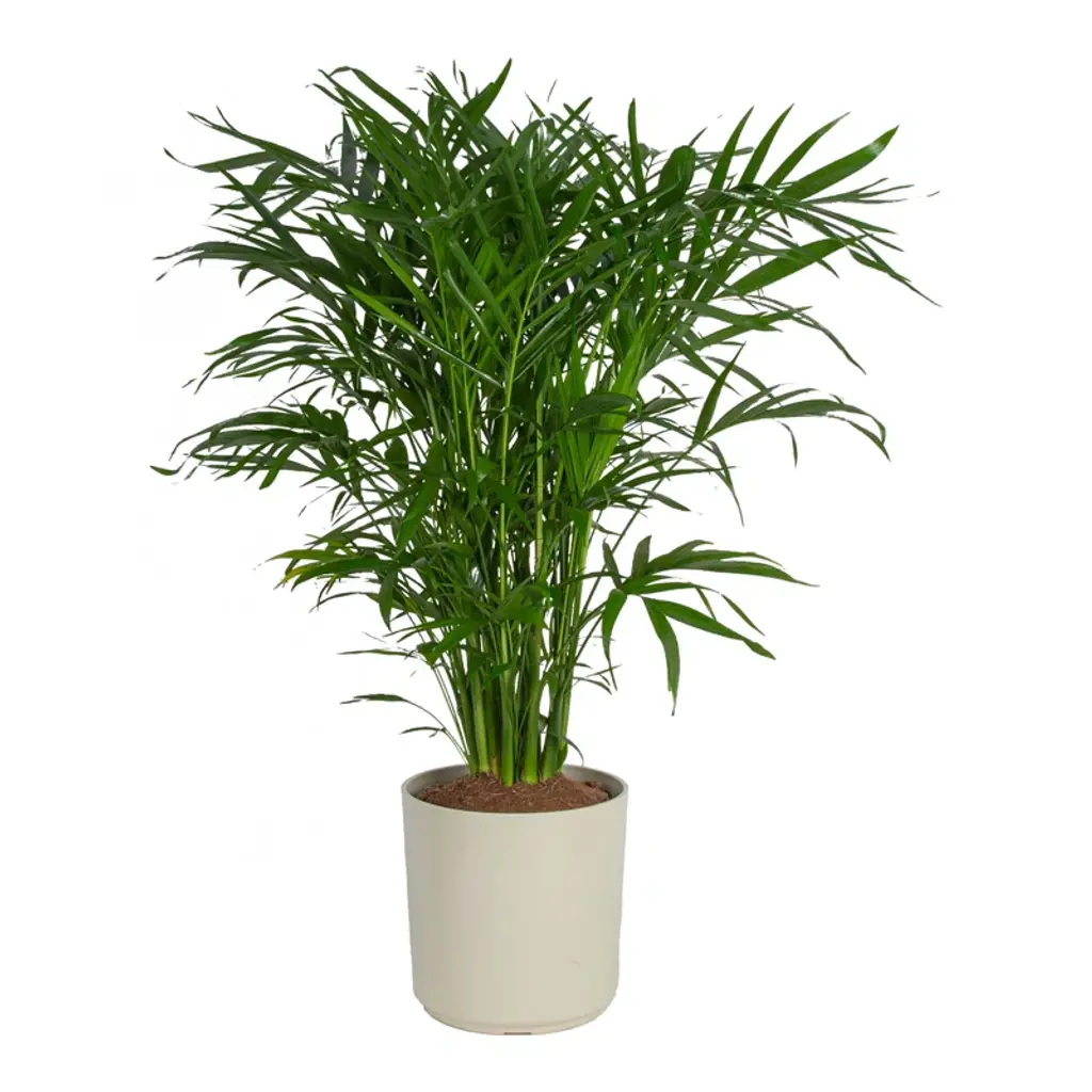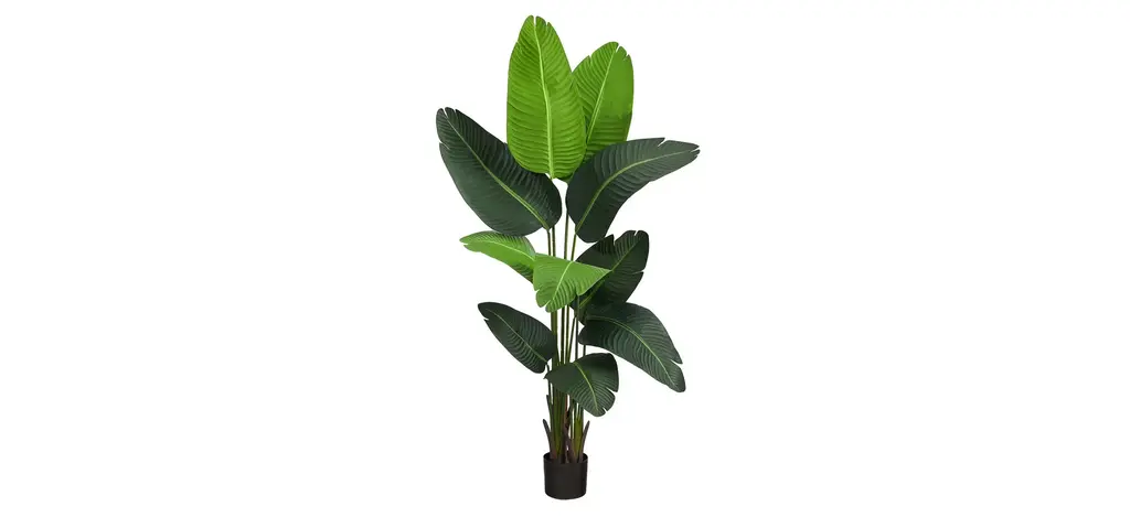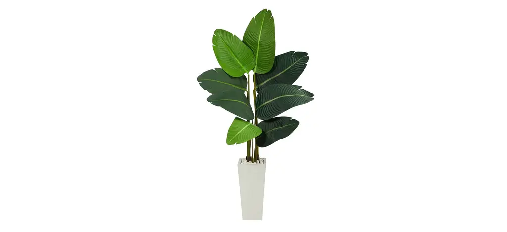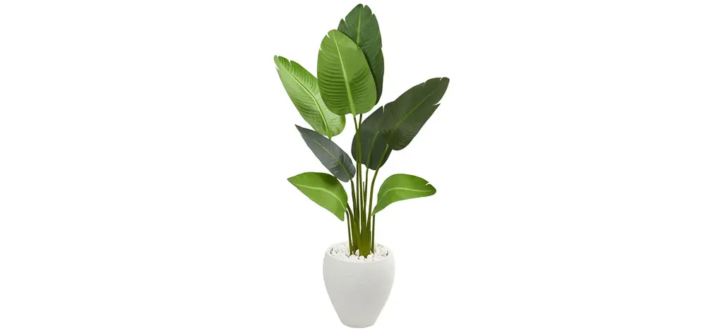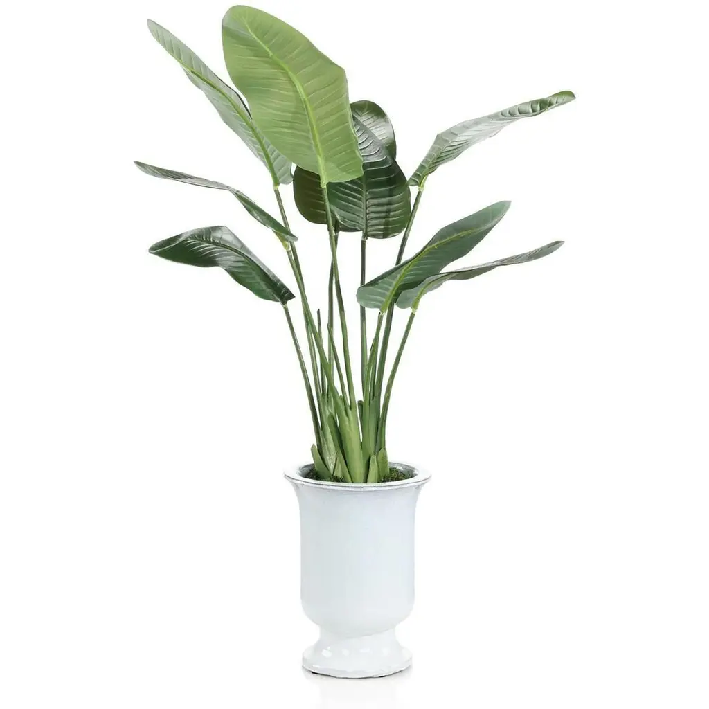 Tropical Bird of Paradise displays towering bird of paradise leaves in an ovate white ceramic vase filled with natural reindeer moss.