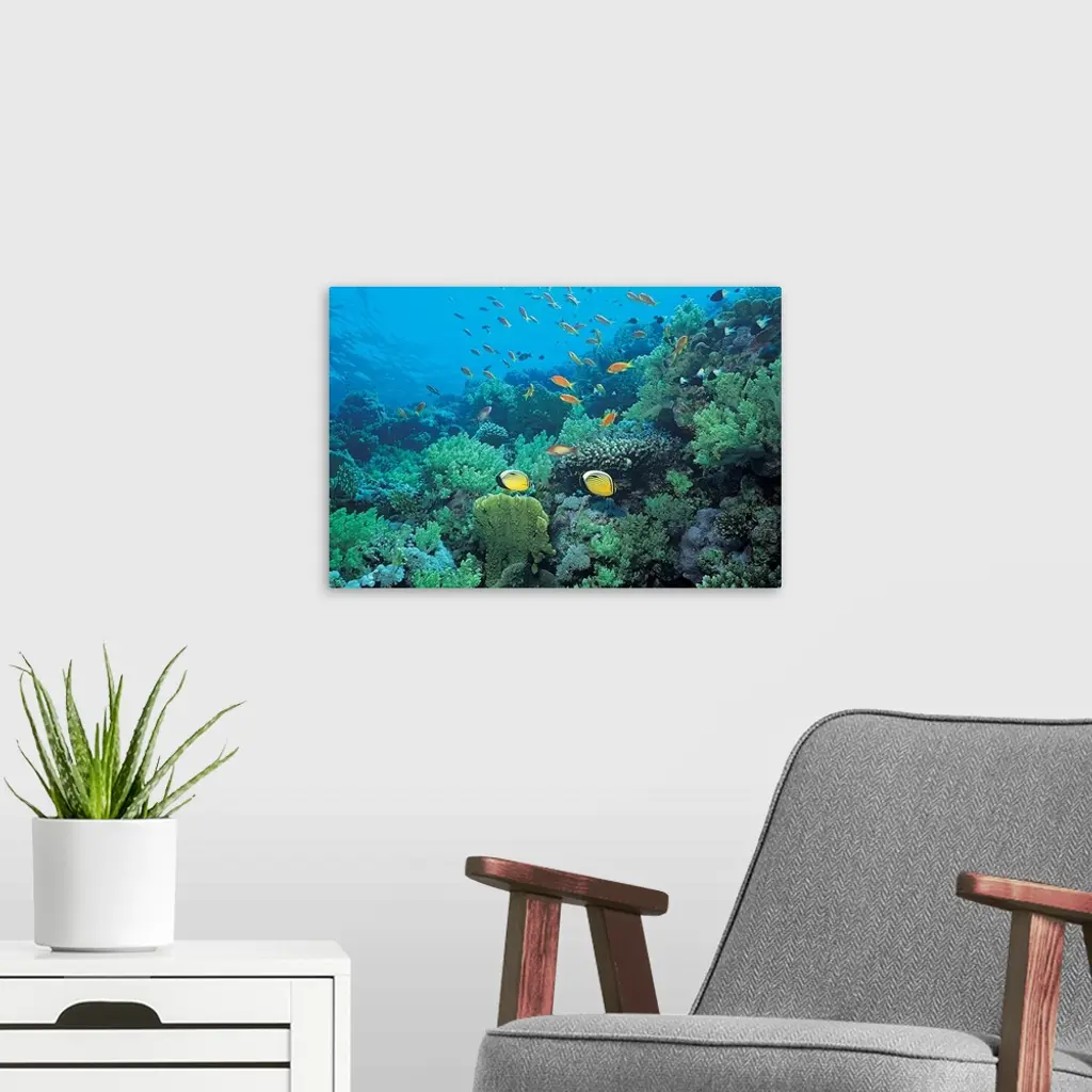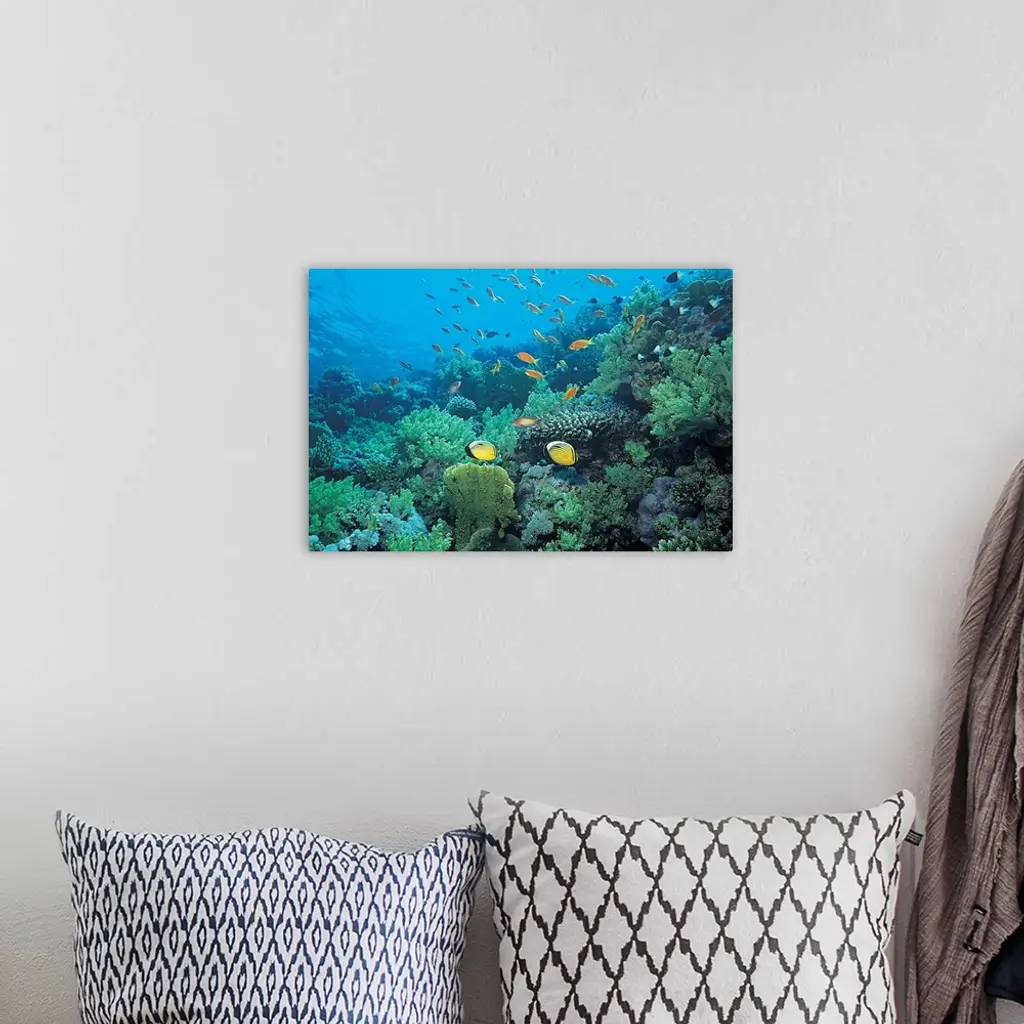 Photograph of underwater sea life with brightly colored fish swimming over coral.