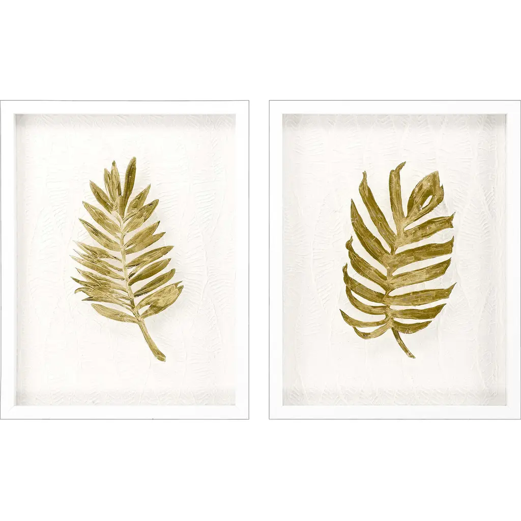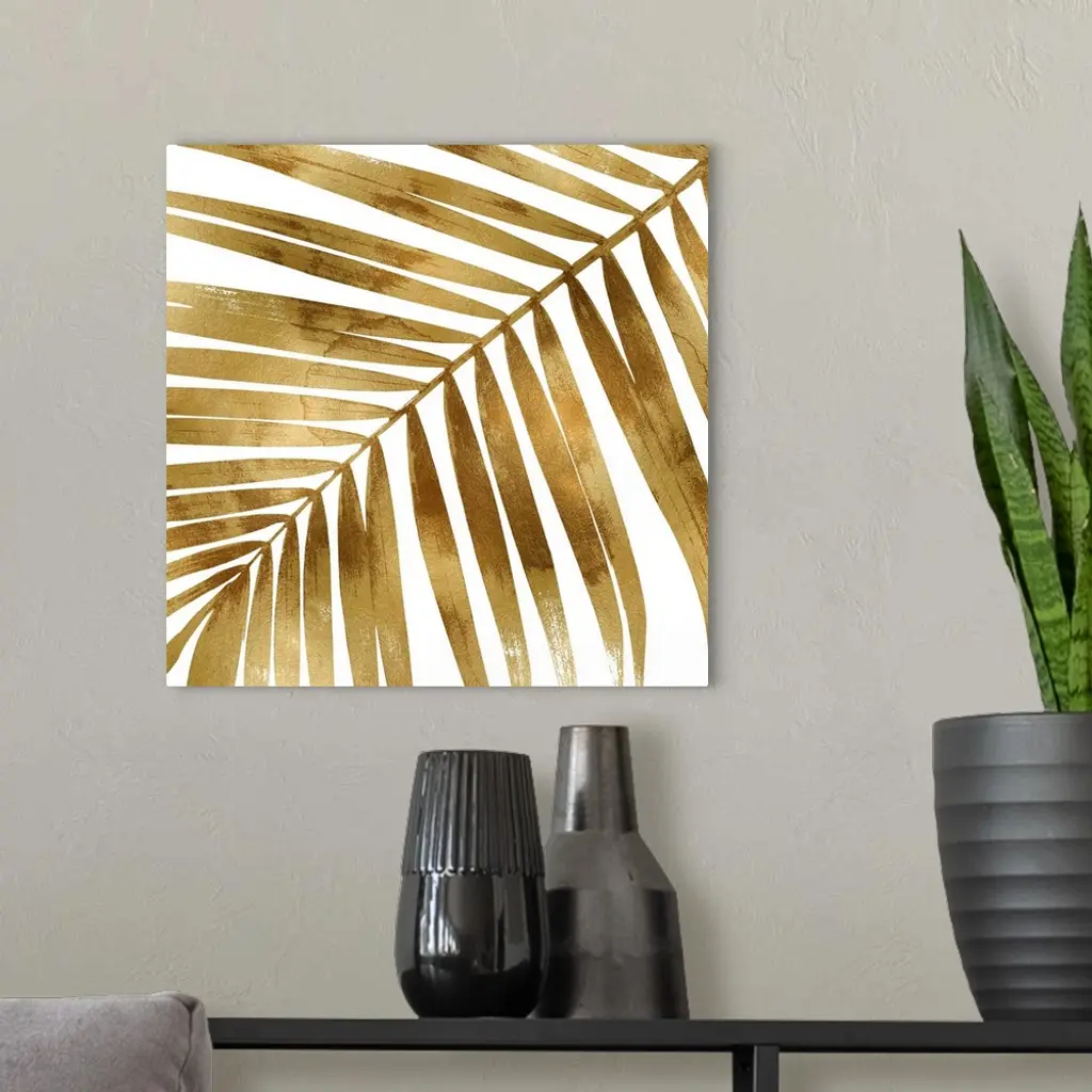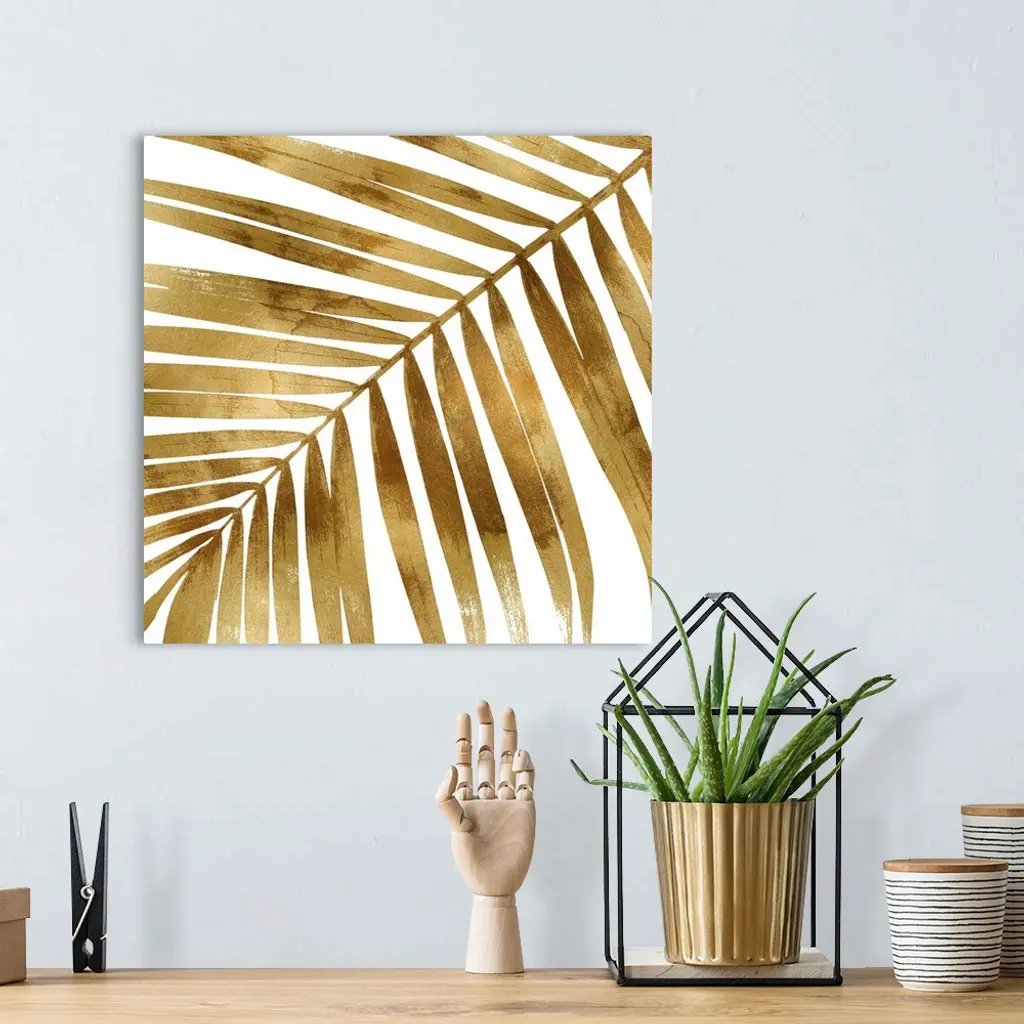 Square decor with a metallic gold silhouette of a palm leaf on a solid white background.