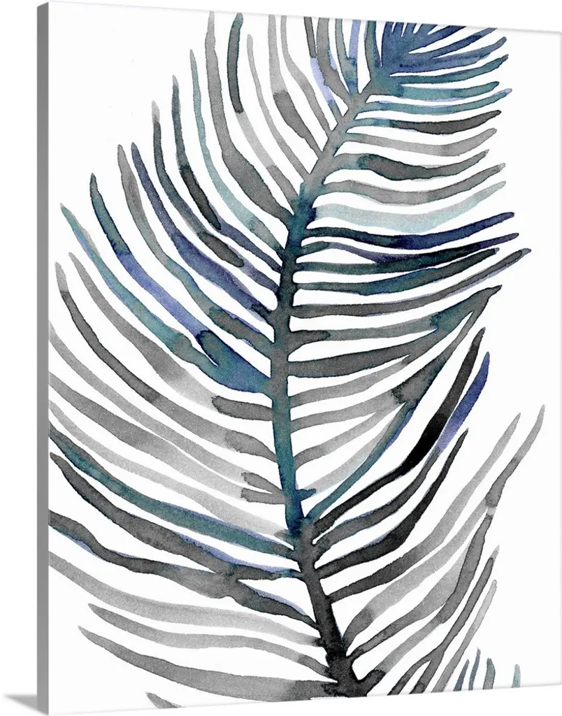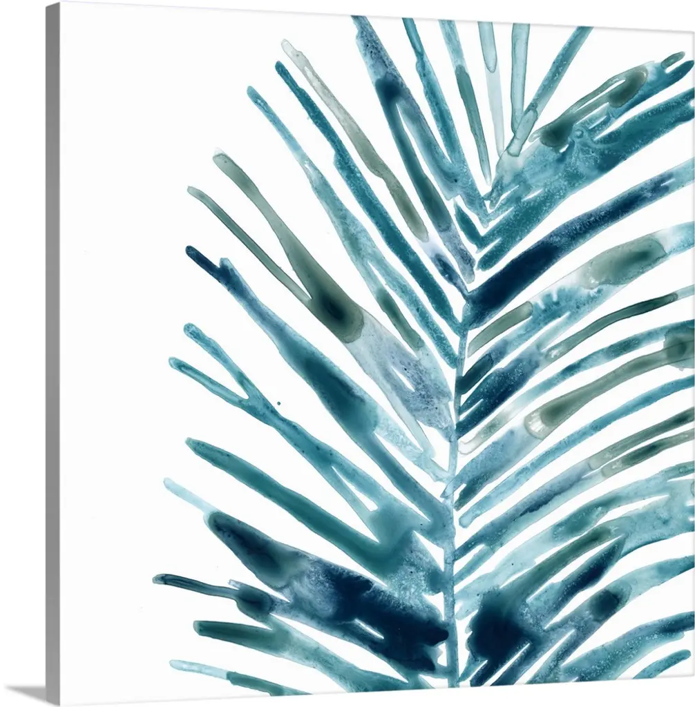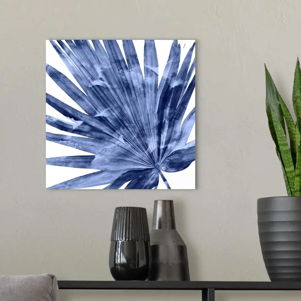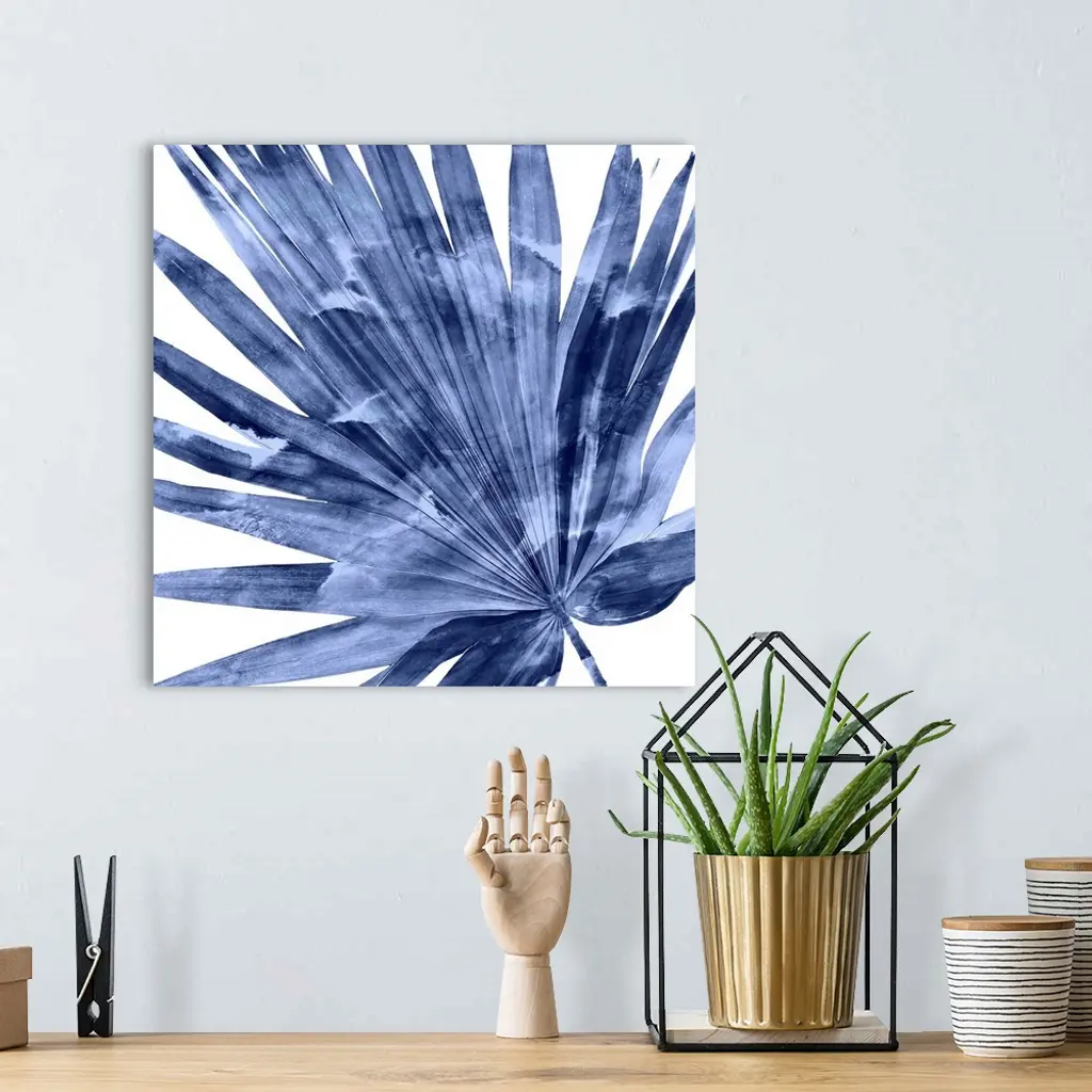 Square decor with an indigo silhouette of a palm leaf on a solid white background.