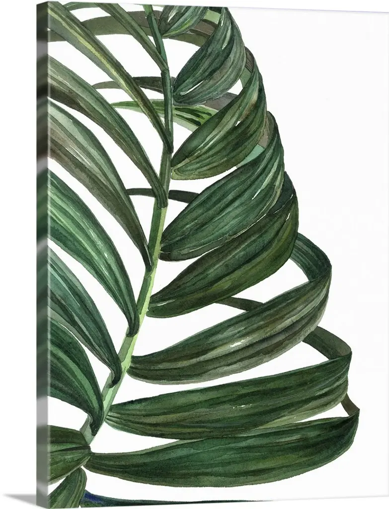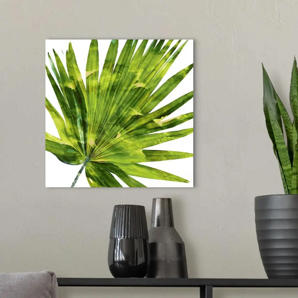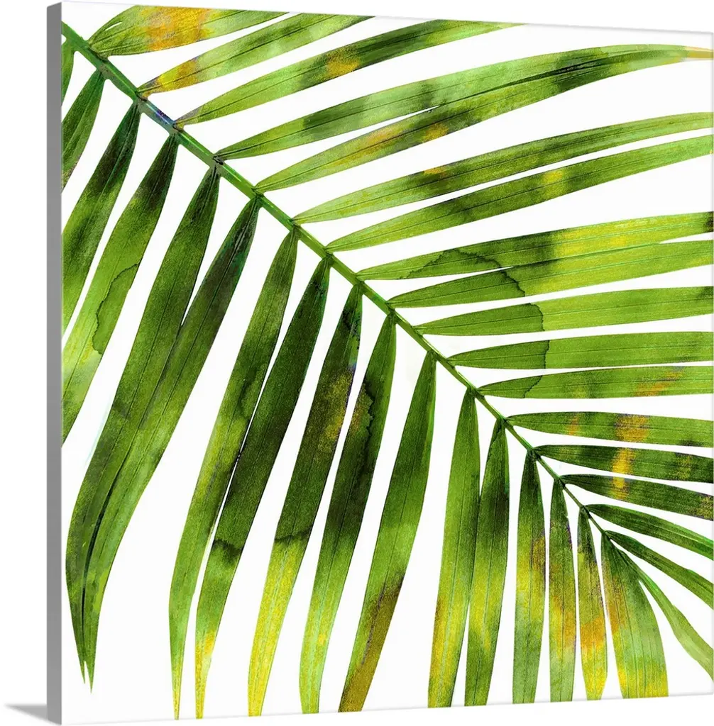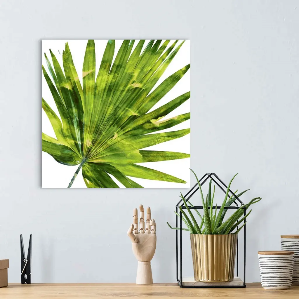 Square decor with a green and yellow silhouette of a palm leaf on a solid white background.
