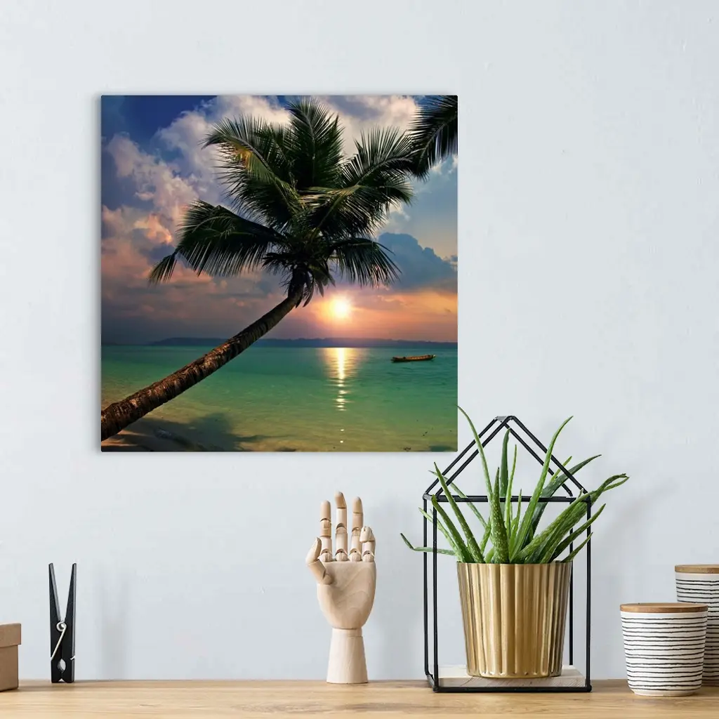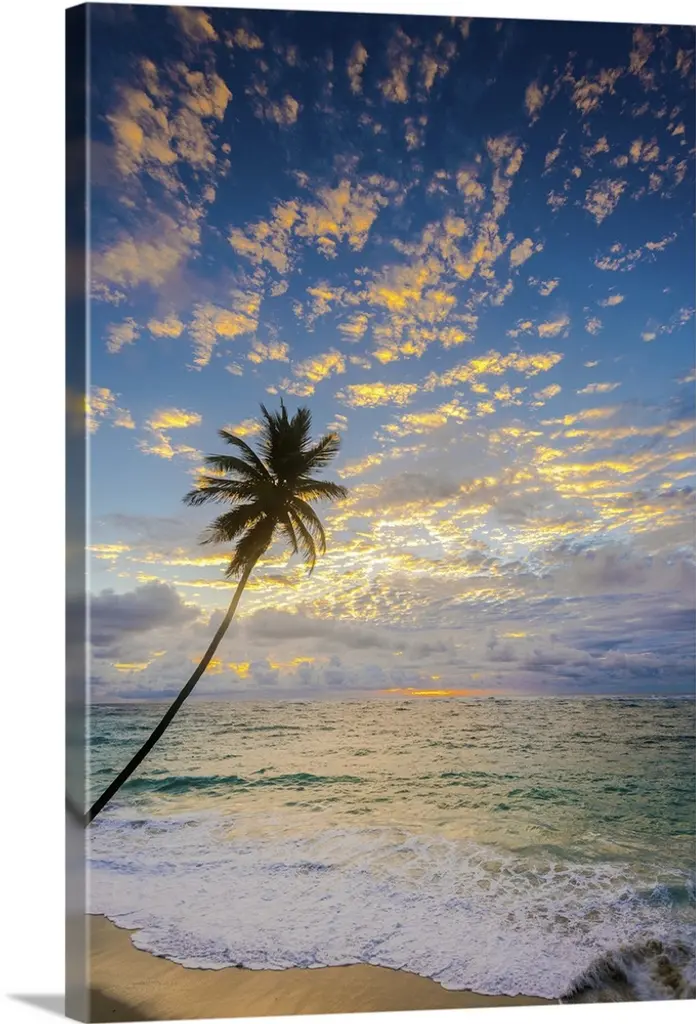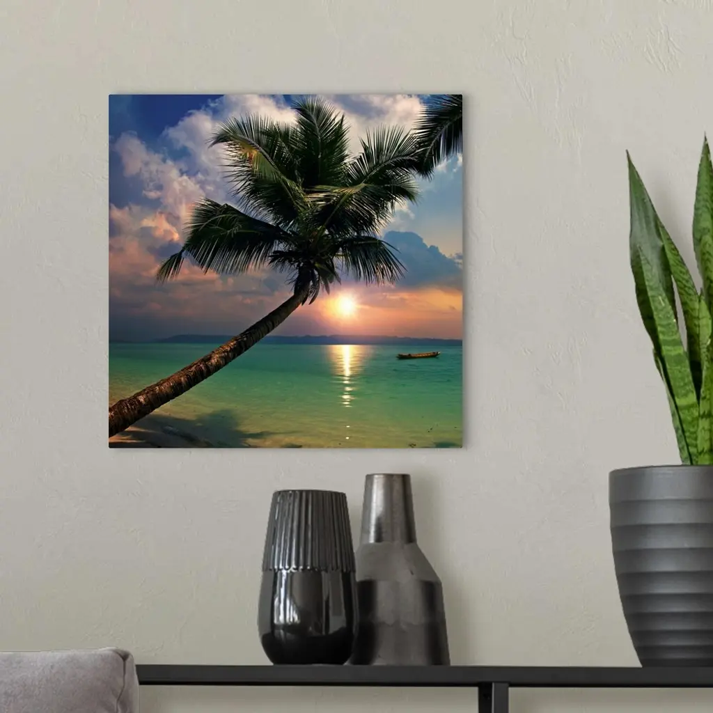 Tropical sea view with green wave splashing on sandy beach and palm tree.