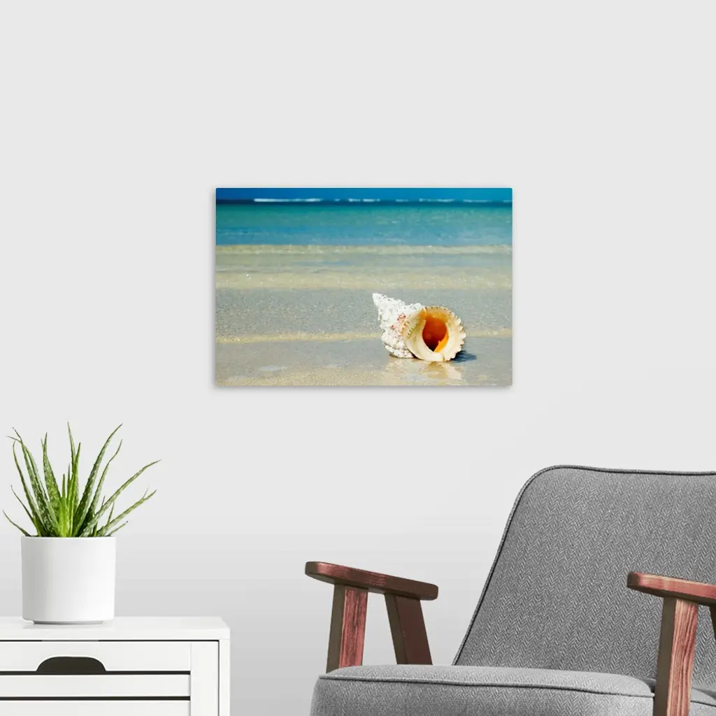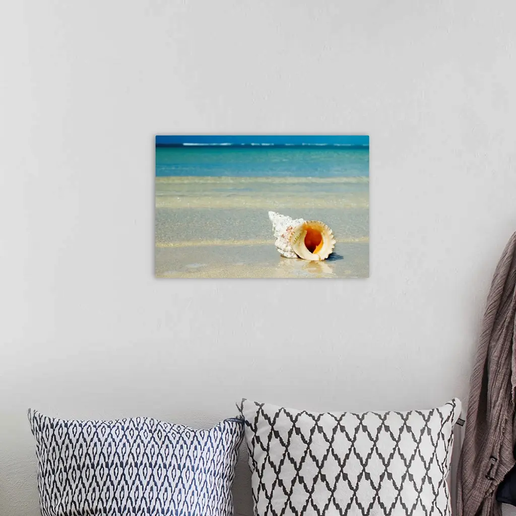 Tropical Seashell On The Beach With Gorgeous Clear Blue Ocean Behind wall art for home and office decor. Discover canvas art prints, photos, mural, big canvas art and framed wall art in GreatBigCanvas.com's varied collections.