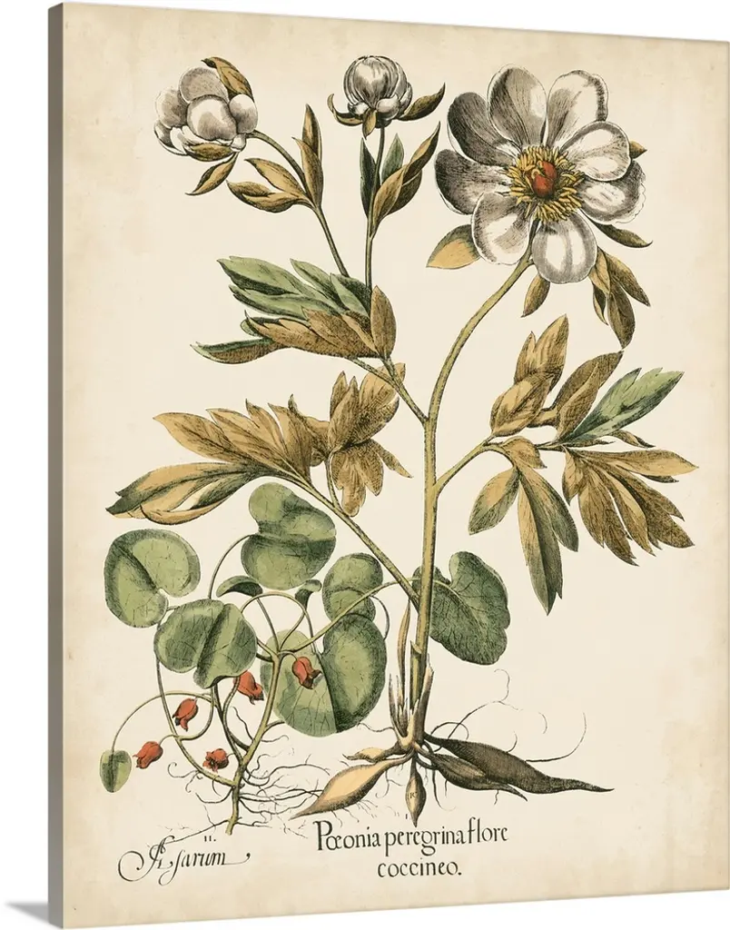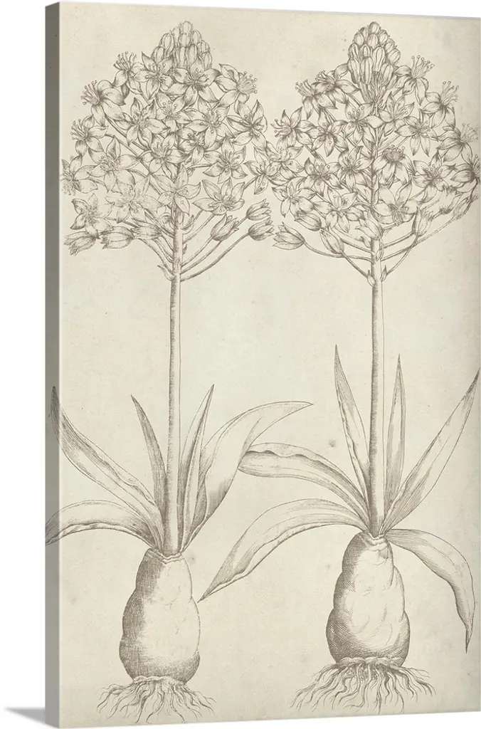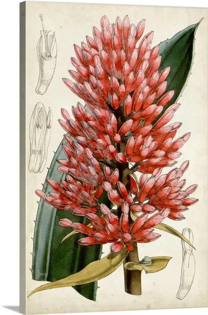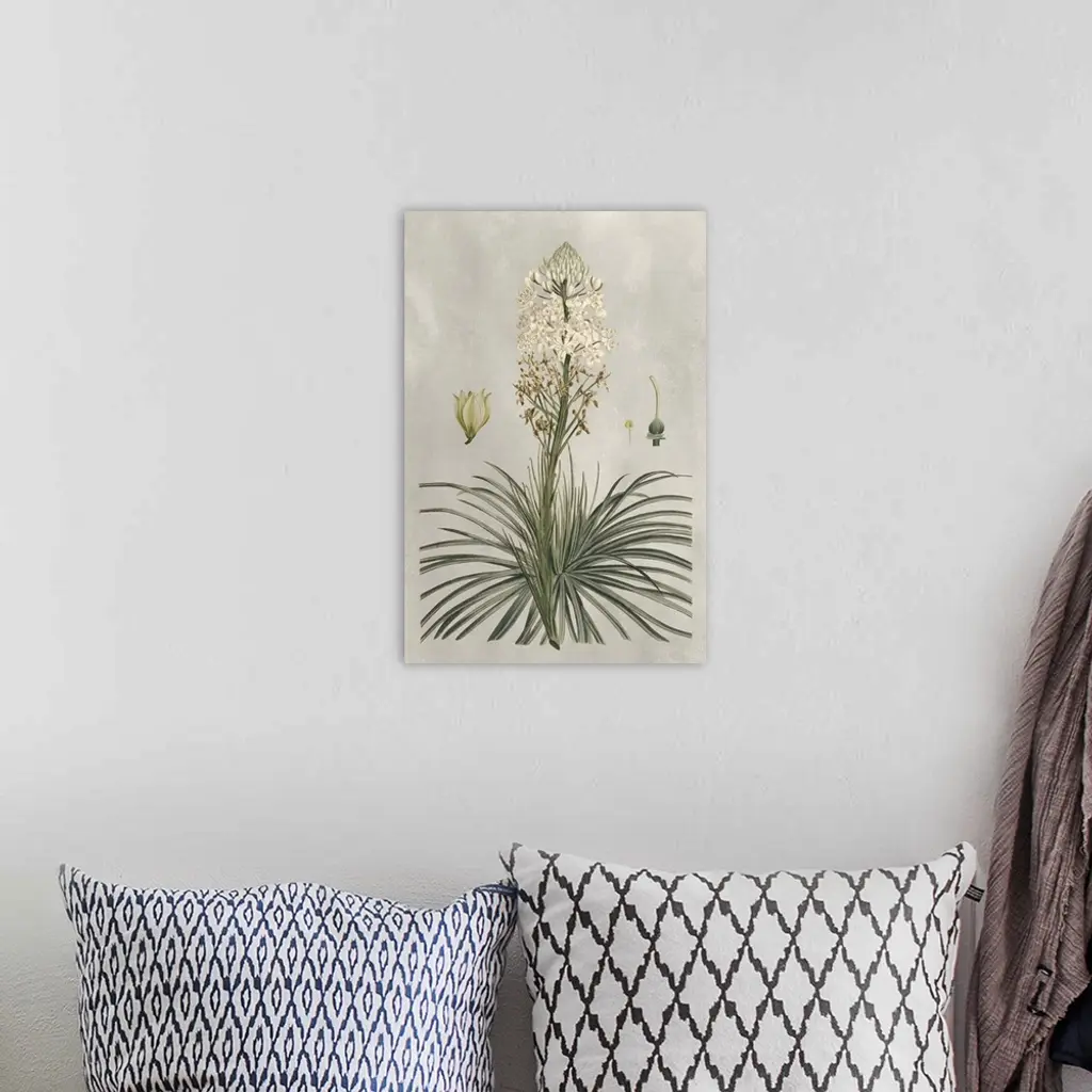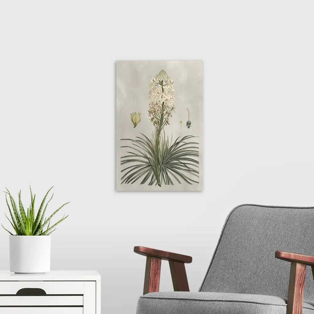 Illustrated tropical botanicals in shades of green, yellow, and cream on a gray background.