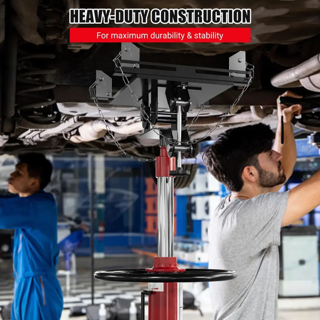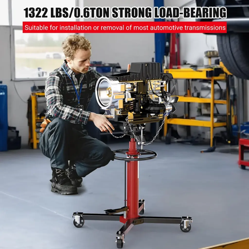 TROPOW 1322LBS Transmission Jack ¨C Heavy Duty Hydraulic Jack with 2-Stage Telescoping (34.3"-68.5" Lift Range) for Automotive RepairKey Features & Specifications:Professional-Grade Capacity1322 lbs (3/5 ton) load capacityHigh-grade steel construction96.56 lbs stable base weightPrecision Positioning System30¡ã adjustable tilt saddle2-stage telescoping mechanism34.3"-68.5" lifting rangeWorkshop Mobility4 swivel casters for easy repositioningCentral push/pull ring74 x 44 x 27 cm compact footprintSafety-Focused DesignDual safety anchor chainsWide stability baseFoot-operated hydraulic pedalUniversal Automotive UseIdeal for:? Transmission removal/installation? Light truck maintenance? Garage repair stations
