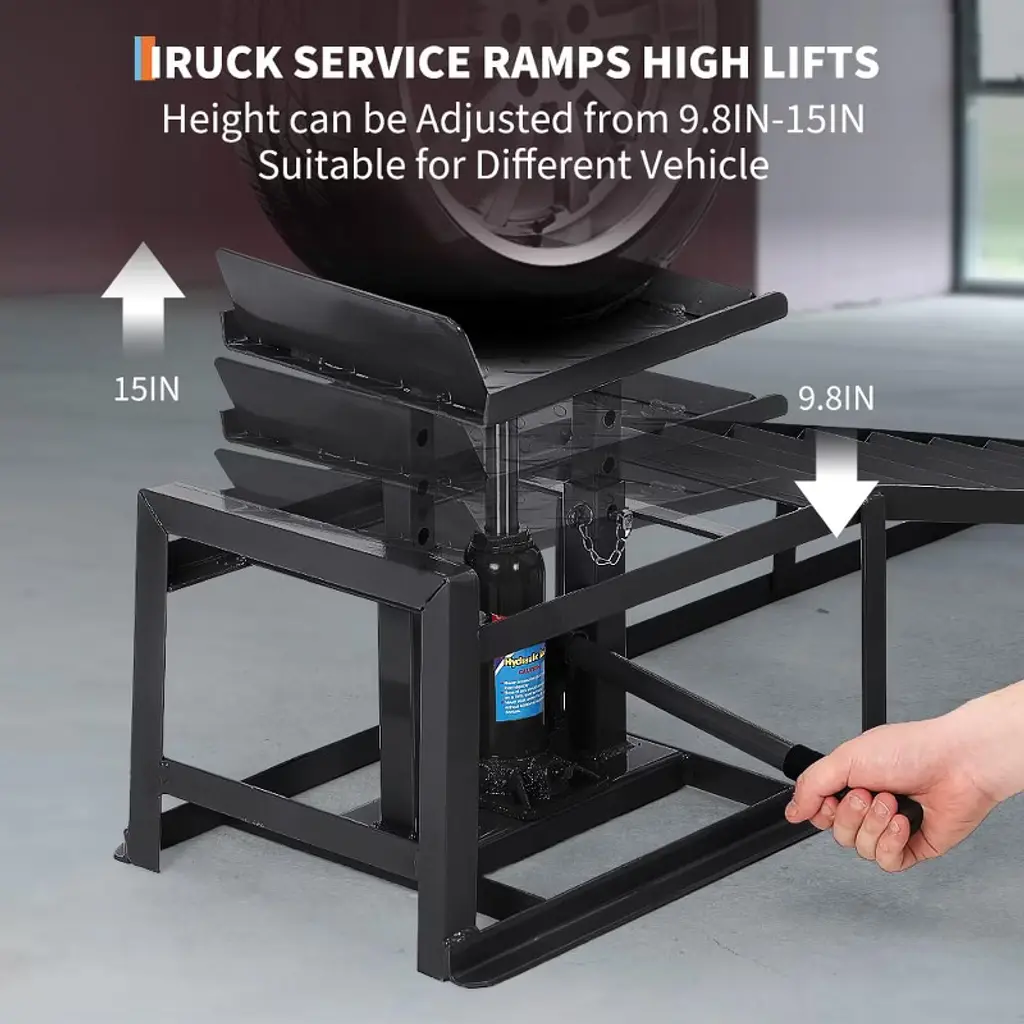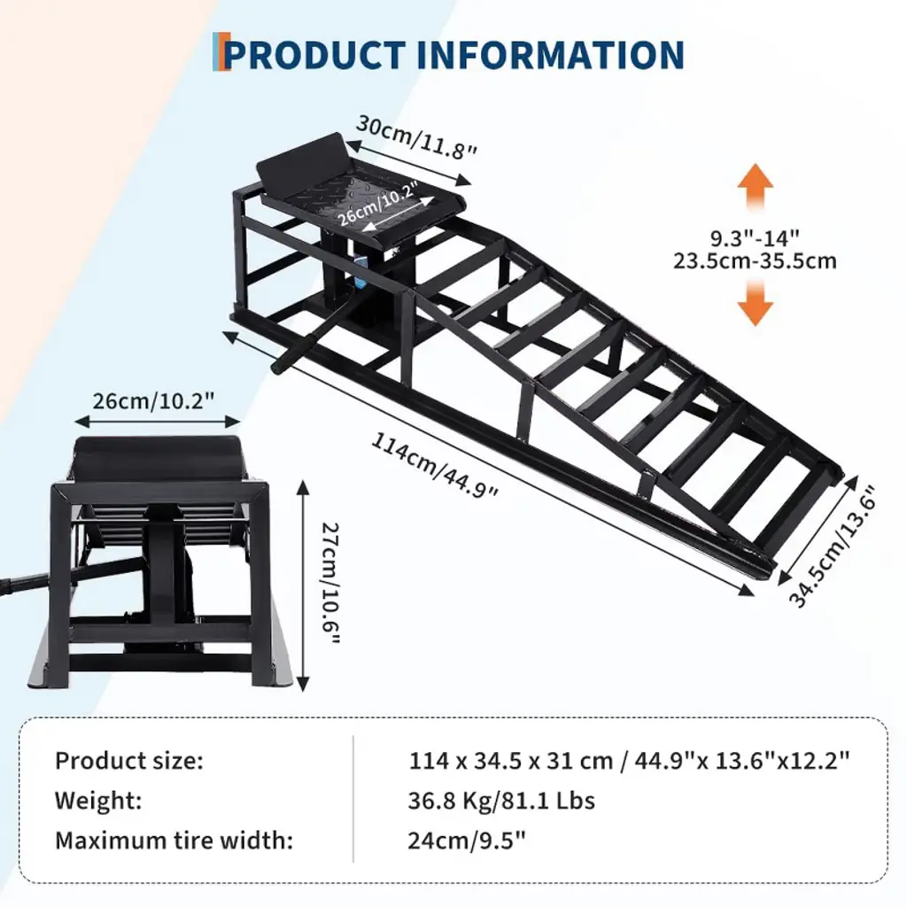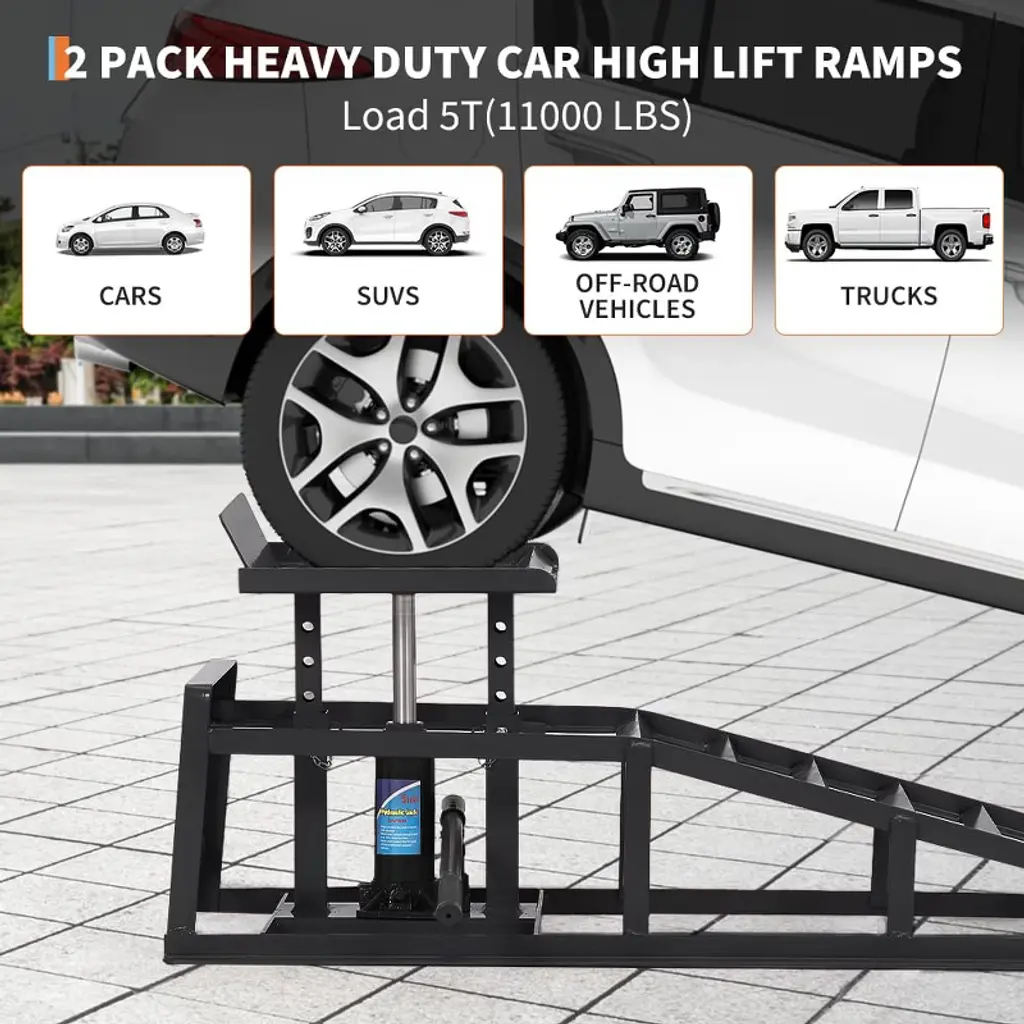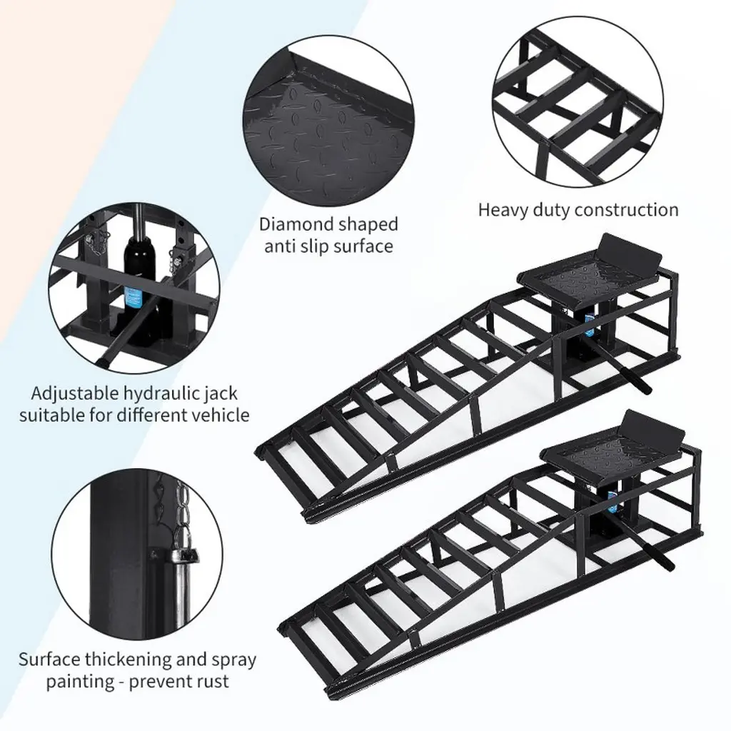 Heavy-Duty Hydraulic Car Ramps - 5-Ton Capacity Adjustable Vehicle Lift for Professional & Home Garage Use (Black, 2-Pack)Premium Features:Industrial-Strength Construction11,000 lb (5-ton) weight capacity per pairHeavy-gauge carbon steel constructionReinforced structural design for maximum stabilityRust-resistant black powder coating finishAdvanced Hydraulic Lift SystemSmooth height adjustment from 9.8" to 16.21"Integrated hydraulic mechanism in each rampAccommodates vehicles with low ground clearancePerfect for sports cars, trucks, and SUVsProfessional Safety EngineeringDiamond-tread anti-slip surface textureHigh-friction rubber base stabilizers47"L ¡Á 16"W ¡Á 14"H dimensions per ramp45" base length with 13.5" width for secure positioningOptimized Workspace Design9.4" wide working platformBeveled approach edges for easy drive-on86 lb total weight for stability during useTextured surface prevents tire slippageVersatile Maintenance SolutionIdeal for oil changes, brake work, and inspectionsSuitable for professional shops and DIY enthusiastsIncludes clear setup instructionsNo assembly required - ready to use immediatelyTechnical Specifications:Brand: TROPOWMaterial: Reinforced carbon steelColor: Black powder coatDimensions: 47"L ¡Á 16"W ¡Á 14"H (per ramp)Weight: 86 lbs (pair)Capacity: 11,000 lbs (5 tons)Height Range: 9.8"-16.21" (25-41cm)Platform Width: 9.4 inchesIncluded: 2 hydraulic service ramps