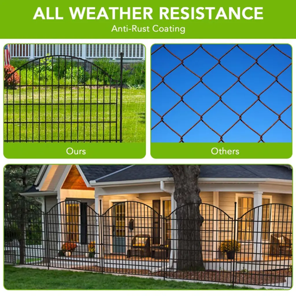 "15-Panel Curved Decorative Garden Fence - 32in Rustproof Metal Animal Barrier (Black)" - Premium No-Dig Landscape SolutionPremium Features:Commercial-Grade Construction2.8mm thick powder-coated steel with reinforced welded jointsRust-proof epoxy coating withstands 10+ years of outdoor exposureMarine-grade hardware for coastal climate durabilityUV-resistant finish maintains color in all weather conditionsVersatile Protection System36 linear feet coverage (15 curved panels)1.39" mesh spacing prevents small animal intrusion32" height ideal for containing pets and protecting gardensMulti-species barrier (dogs, rabbits, chickens, turtles)Flexible InstallationNo-dig design with included ground stakesCurved panel system for elegant contoursExpandable configuration for custom layoutsQuick assembly (under 30 minutes for full setup)Decorative & FunctionalElegant curved wire design enhances landscapesCreates defined spaces for gardens, patios and play areasTemporary or permanent installation optionsSeasonal adaptability for year-round useEasy Maintenance & StorageWipe-clean surface requires no special careCollapsible design for compact storagePanel replacement system for easy repairsWeather-resistant (-30¡ãF to 120¡ãF tolerance)Technical Specifications:Panel Dimensions: 32"H x 28.8"W (curved)Material: 2.8mm powder-coated steelMesh Opening: 1.39"Weight: 52 lbs (complete set)Color: Matte BlackCoverage: 36 linear feetIncluded: 15 curved panels + 16 stakes