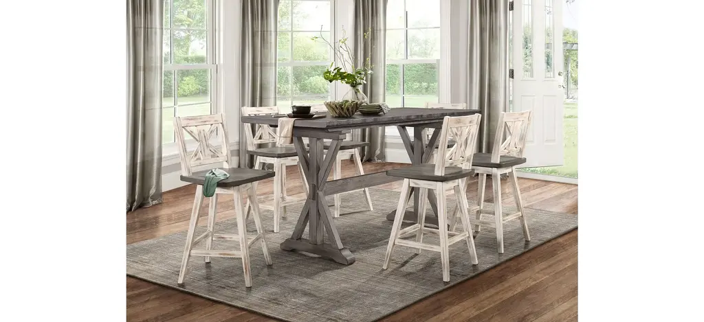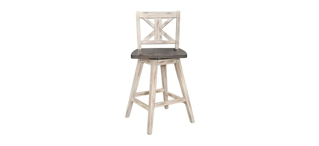 The Trouvaille counter height swivel dining chair creates a subtle, rustic look. A gray finish graces the solid rubberwood dining chair, highlighting the veneer offered in white sand. The chairs also feature a swivel mechanism, lending to ease of motion while seated.
