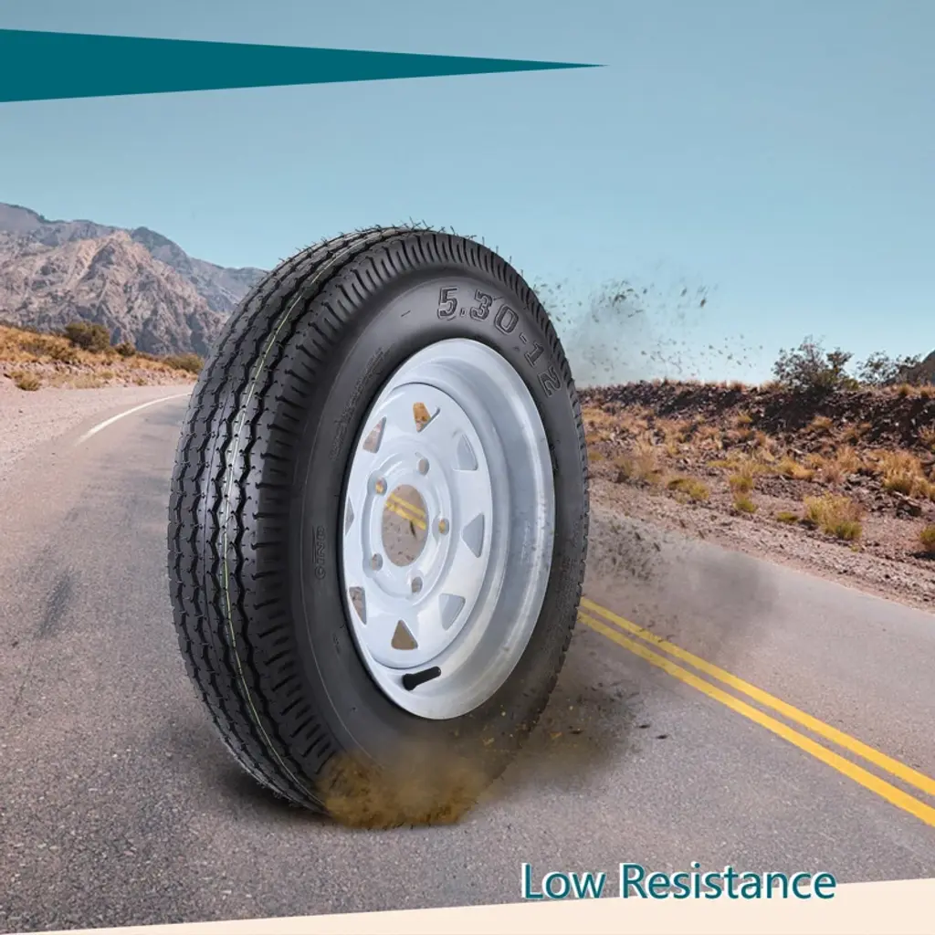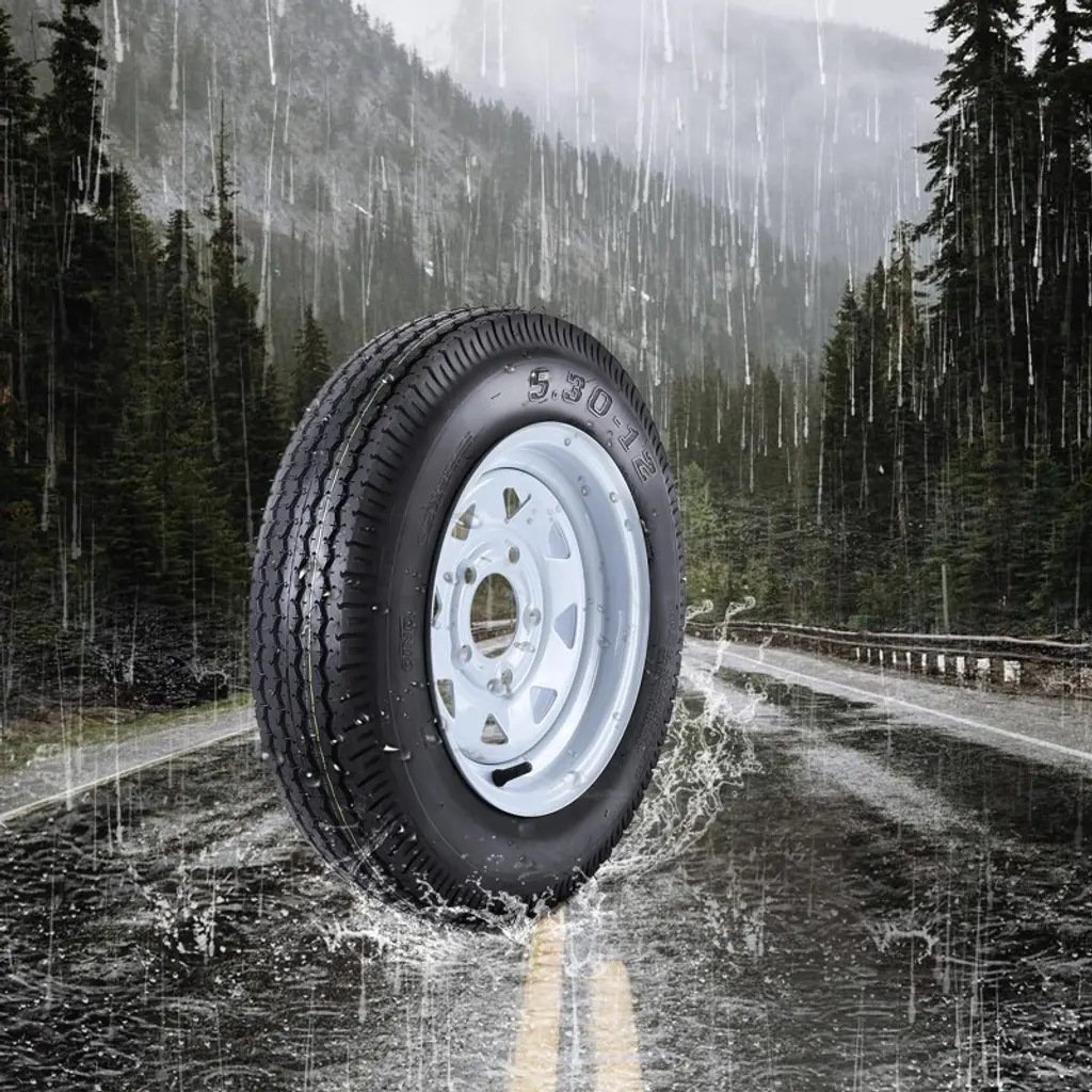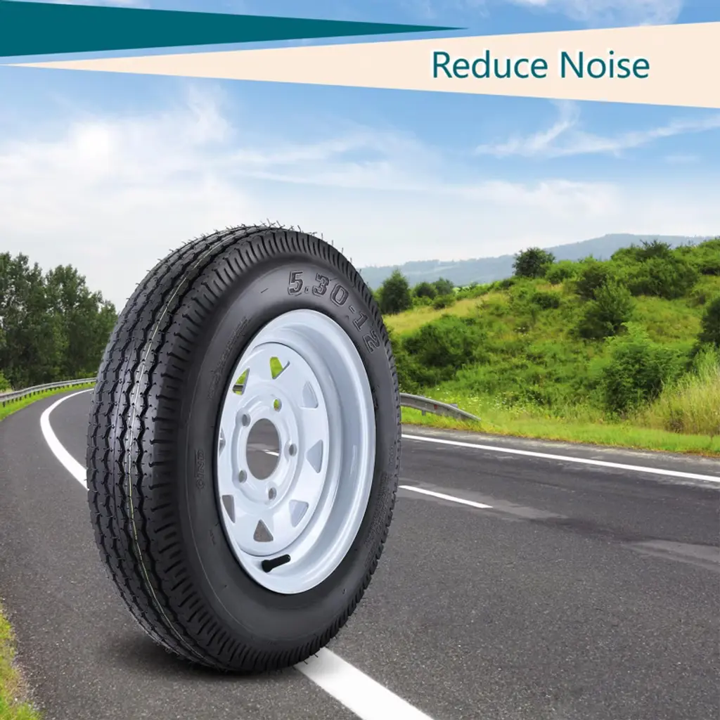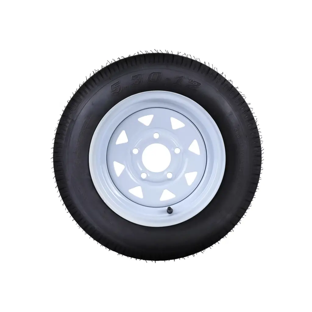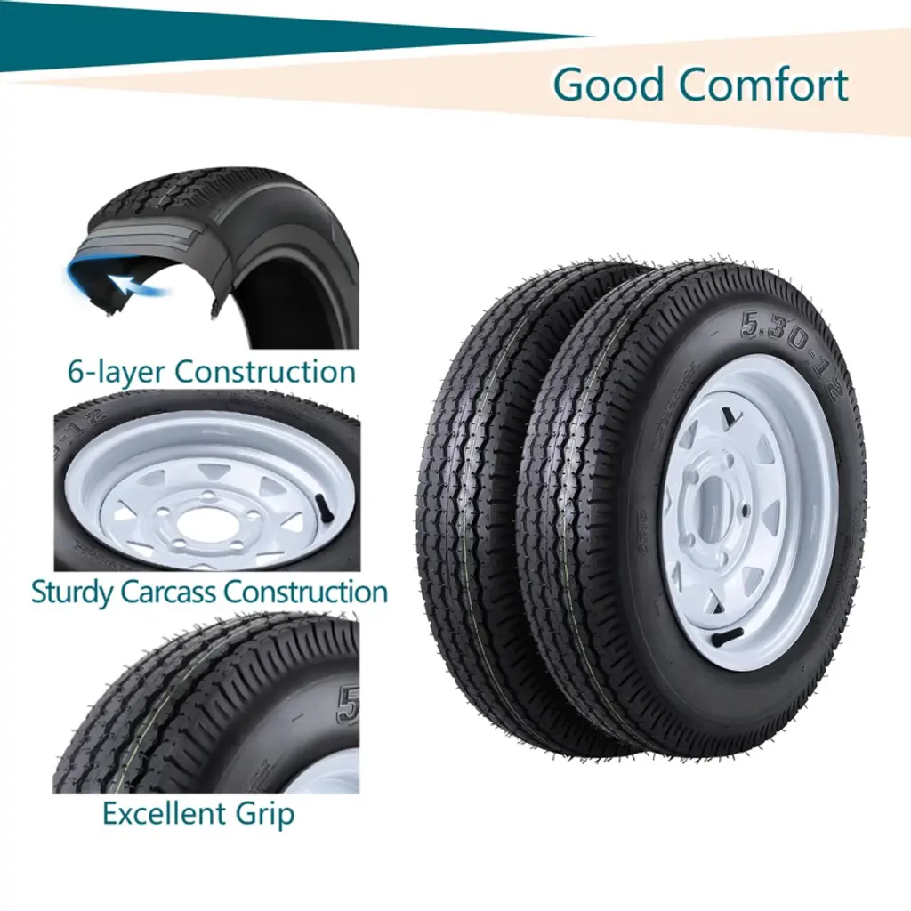 "Trailer Tires and Rims 5.30x12 ¨C 5 Lug White Spoke Wheels (Set of 2) with 6-Ply Load Range C for Universal Fit"Key Features:High-Capacity Performance ¨C Supports up to 990 lbs per tire (Load Index 80) with 6-ply Load Range C construction, ideal for heavy-duty trailer use.Universal Fit & Easy Installation ¨C 5-lug on 4.5" bolt pattern, 3.19" center bore, and 12x4" rim size ensure compatibility with most trailers.Durable Traction ¨C 5mm tread depth and bias-ply construction provide stability and grip for safe towing (Speed Rating: M/81 mph).Reinforced Design ¨C White spoke steel wheels with 8-inch rim diameter and 135mm section width for enhanced load distribution.Complete Set ¨C Includes 2 rims with pre-mounted tires (overall diameter: 21.6 inches), ready for immediate installation.