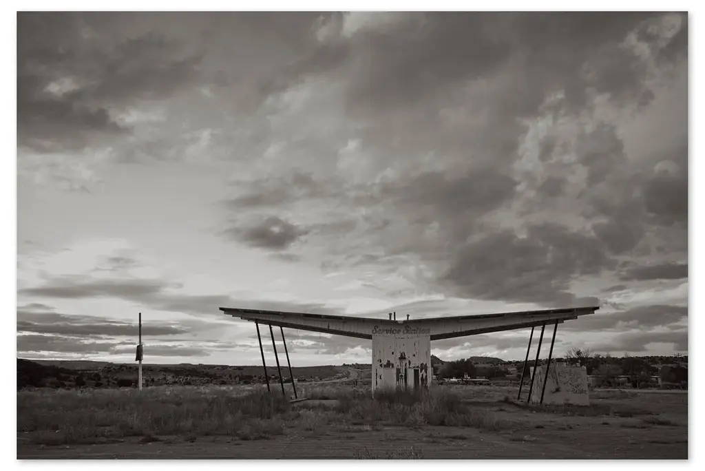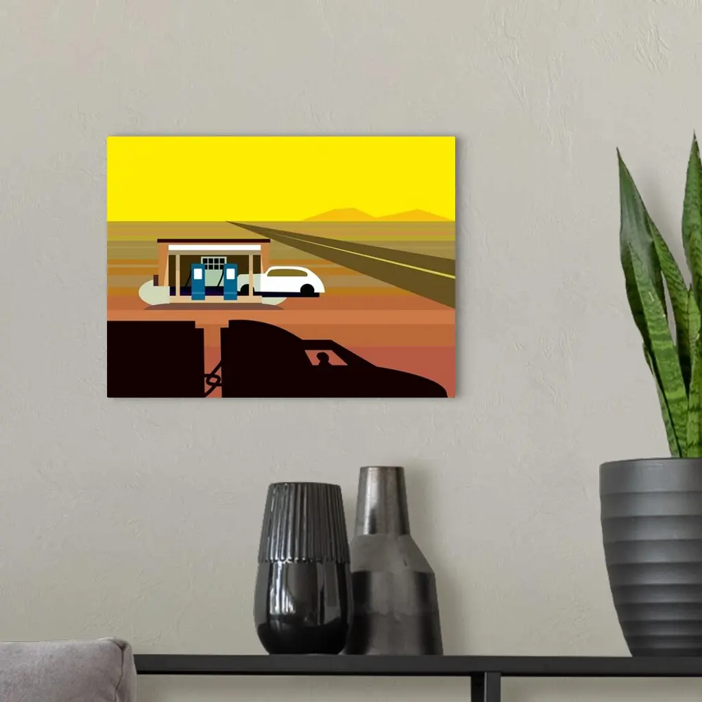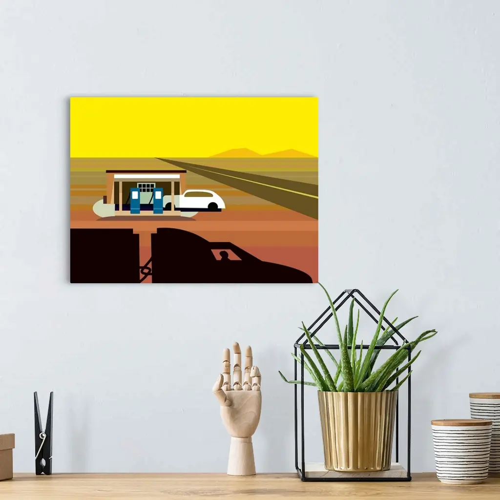 A digital illustration of a gas station in a desert area.