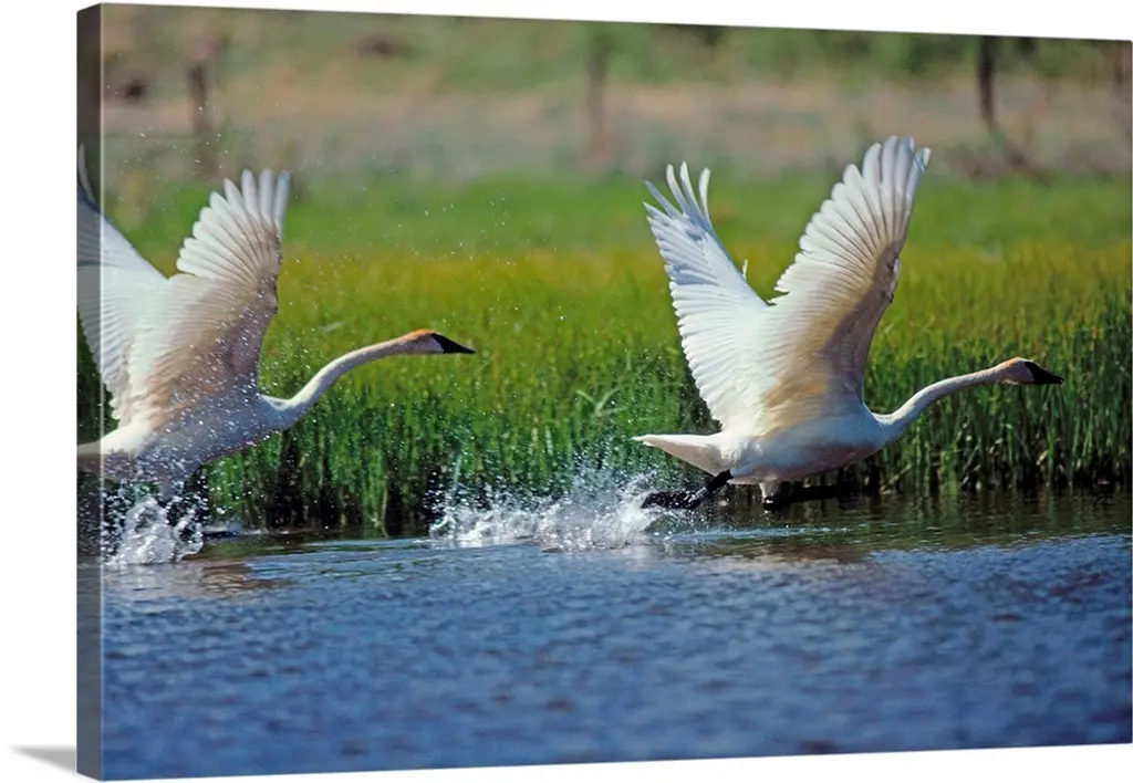Trumpeter Swans (Cygnus buccinator) enjoying a splashing good time in winter at Monticello, MN, USA.
