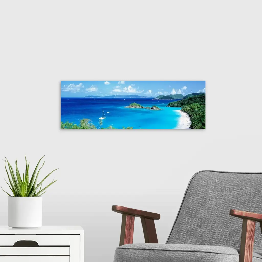 Panoramic photograph of a couple boats sitting in the clear waters of Trunk Bay in the Virgin Islands. The mountains in the foreground and background offer great contrast to the ocean.
