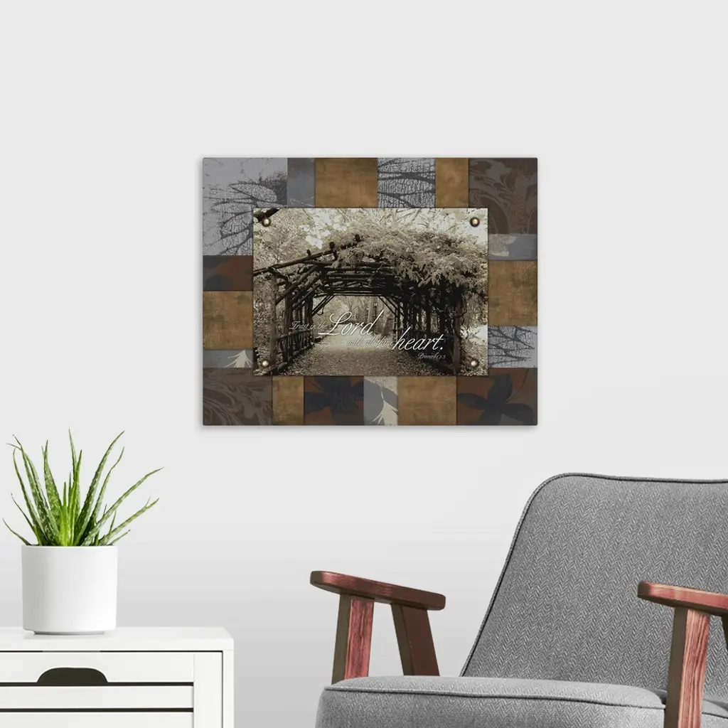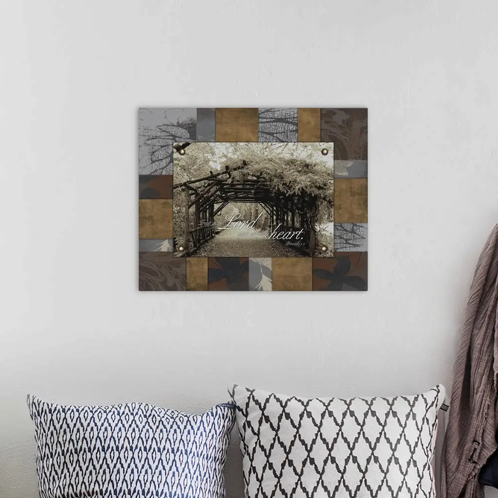 Scripture art against the image of a covered path.