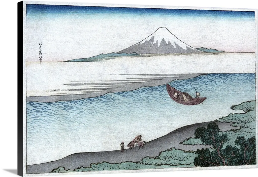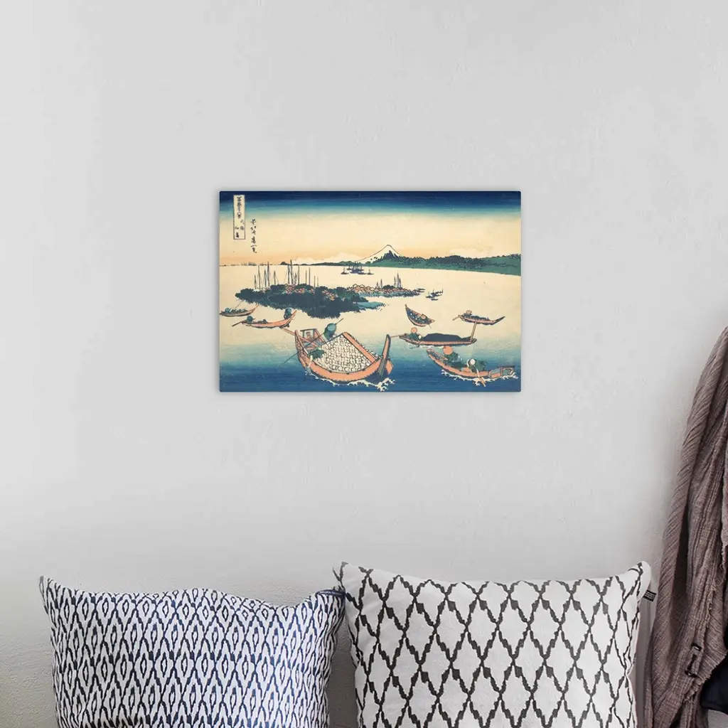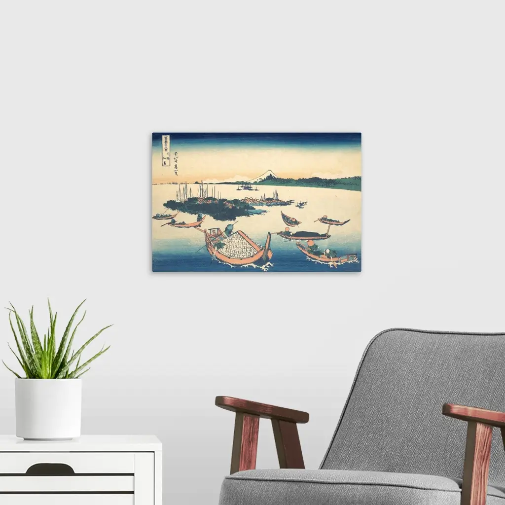 In the foreground a large boat laden with cotton bales moves toward the tiny island of Tsukuda. The boat's shape repeats that of Fuji, creating the rhyming of form so common to Hokusai's style. Other, smaller boats fill the water, giving viewers a sense of the daily life surrounding Tsukuda.