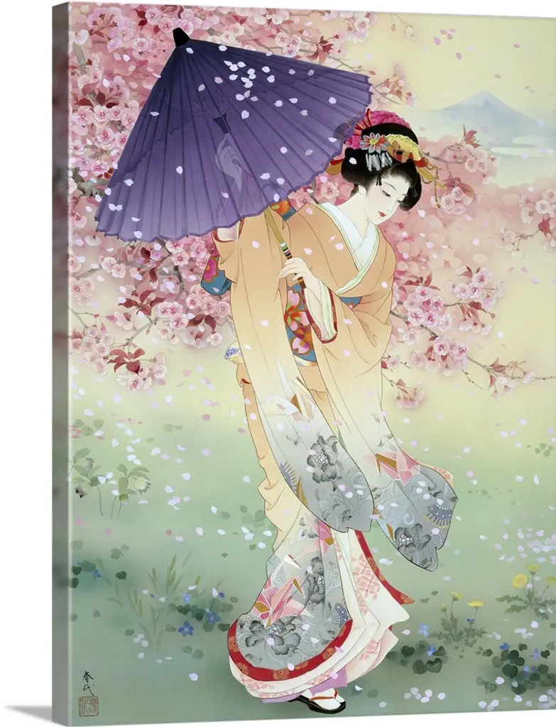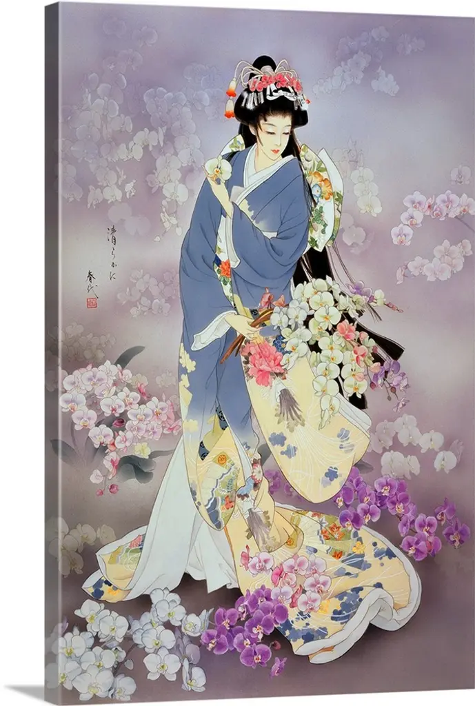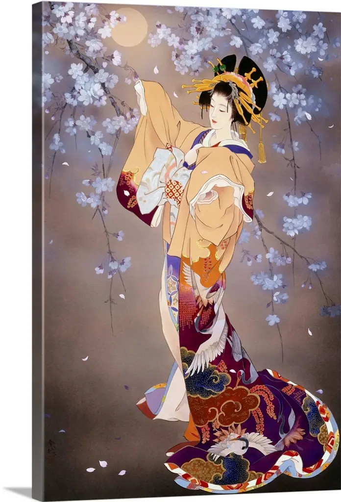 Contemporary colorful Asian art of a Geisha in beautiful ornate clothing.