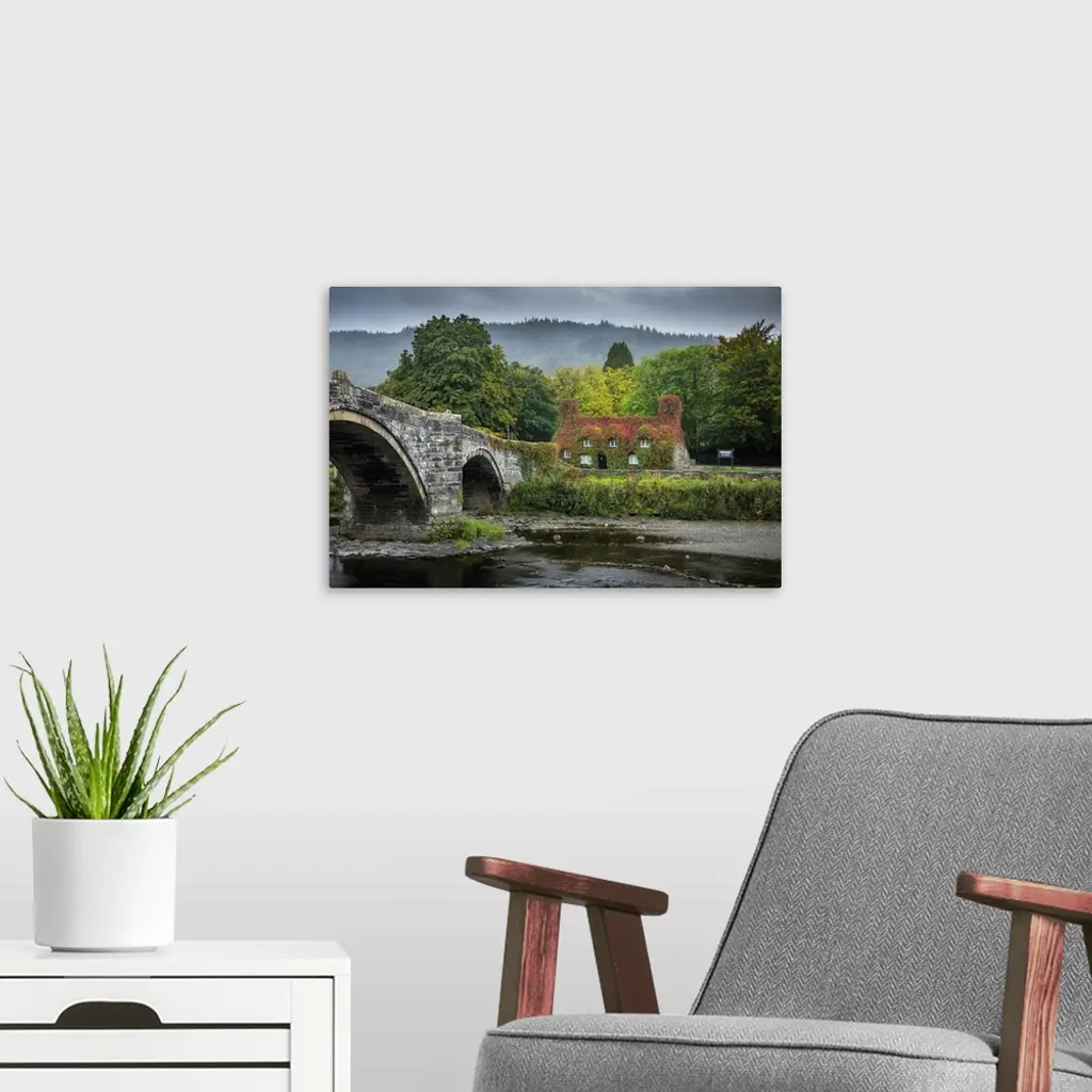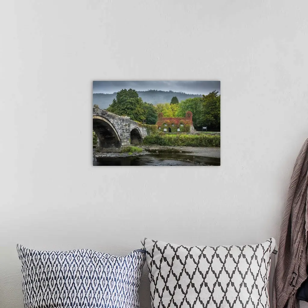 Tu Hwnt l'r Bont Tearooms covered in Virginia creeper in autumn, Llanrwst, Conwy, Wales