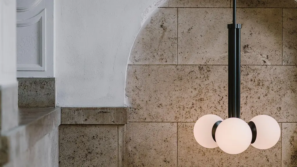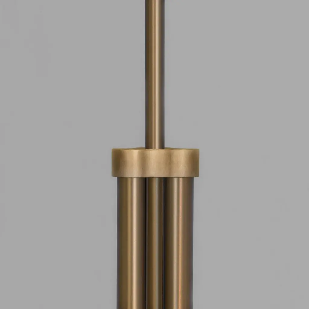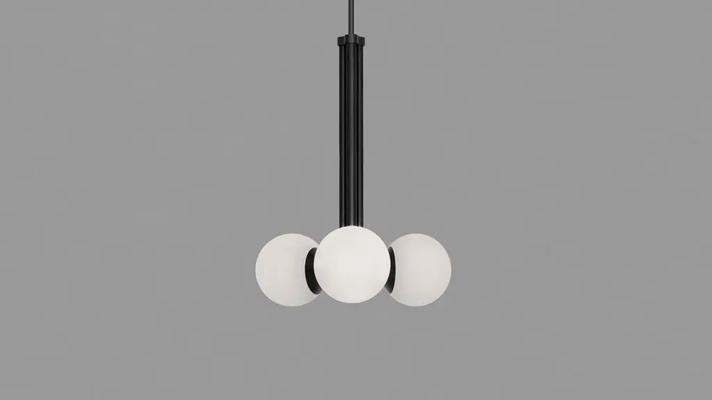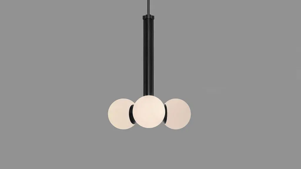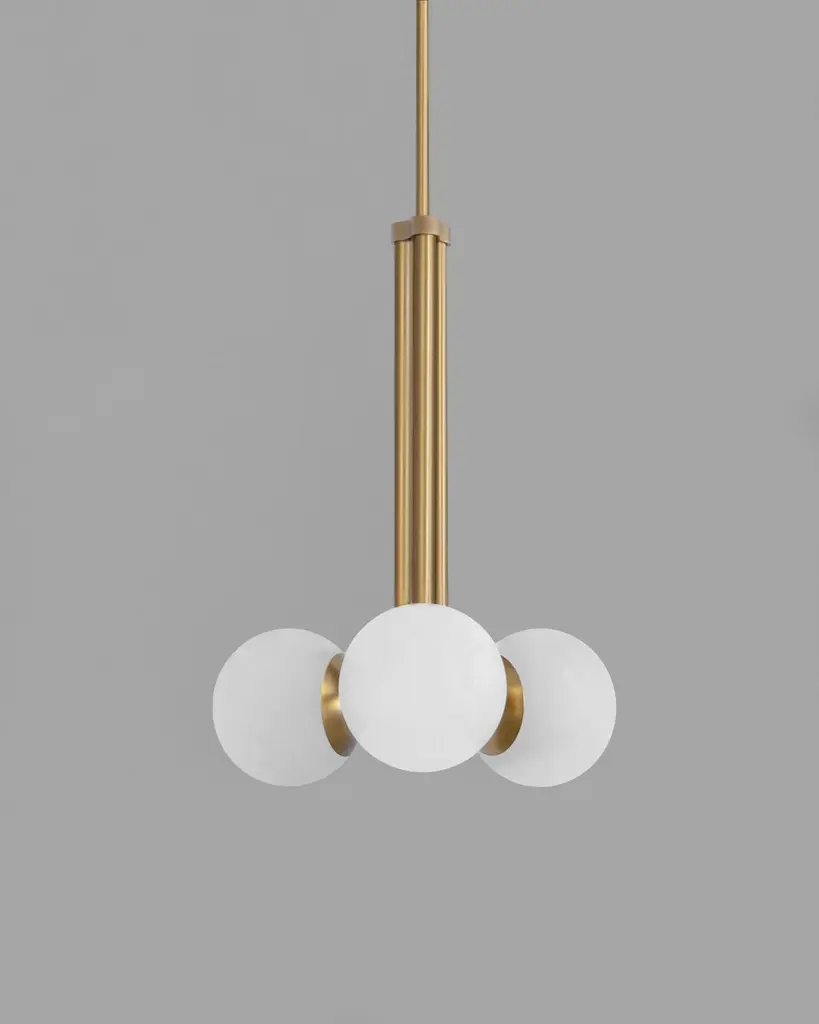 A memory from another new century, an ode to radical simplicity recalling refined Bauhaus style. Deceptively simple, this hovering pendant is clad in opaline glass– three globes project from a triad of brass tubes, emitting a calm and diffuse light.Available in our three signature finishes: Lacquered Burnished Brass (LBB); Black Gunmetal (BGM); Polished Nickel (PN)Odyssey CollectionCome with us on a voyage. To a distant dreamscape where curious wanderers roam. Captured in motion, these gentle machines are destined for the future even as they recall the comfort of home.Playful varieties of shape are composed through a geometric language of pure form, transporting us to scales, and places from our memory and imagination.Dimensions:Diameter: Ø 485 mm / 19.1''Height: 880 mm - 1780 mm / 34.6" - 70.1''(Extension rods included)Weight: 6.4 kg / 14.1 lbLight sources available:LED Bulb (included) 3 x 5 W.