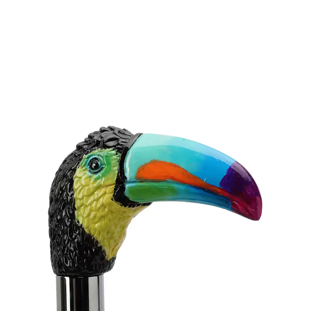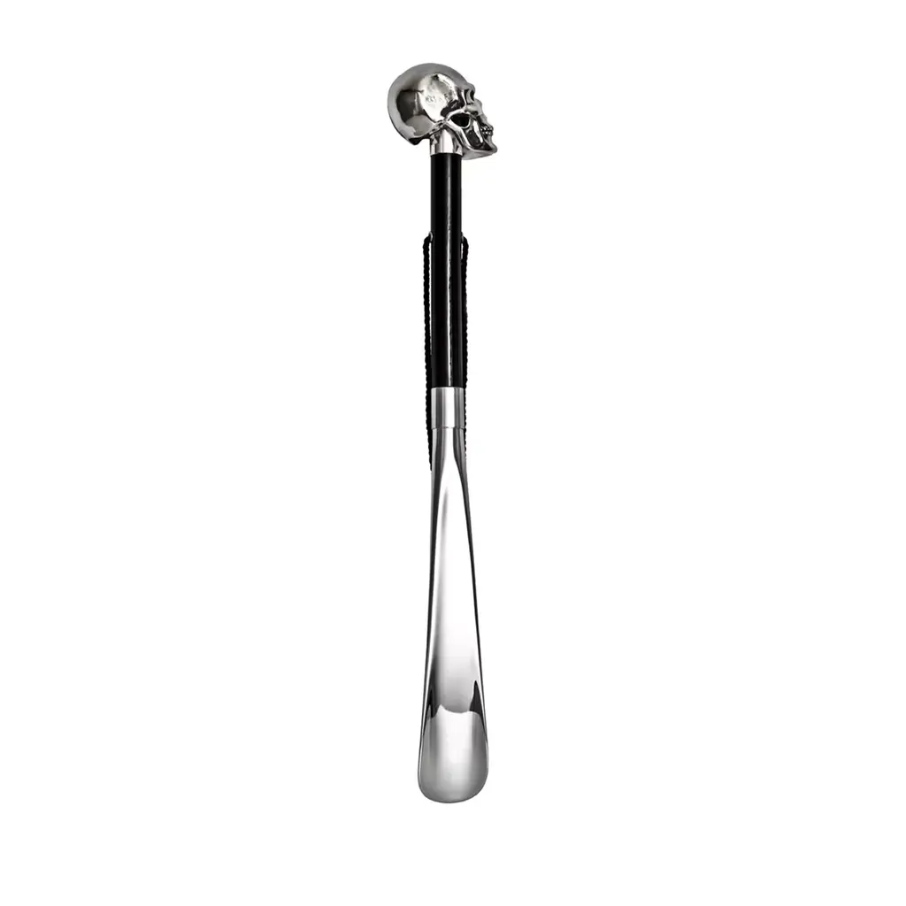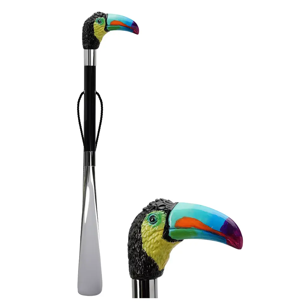 Fashionable and exotic, this handcrafted shoehorn enchants with its vivid tones brightening up the tucan-shaped handle in marble powder that is manually rendered in exquisite details. The underlying body comprises a smooth, silvery ABS paddle connected to the glossy, black-lacquered beech shaft with silver-finished brass rings keeping them in place. Delivered with a branded case, the design is completed with a practical loop fabric.