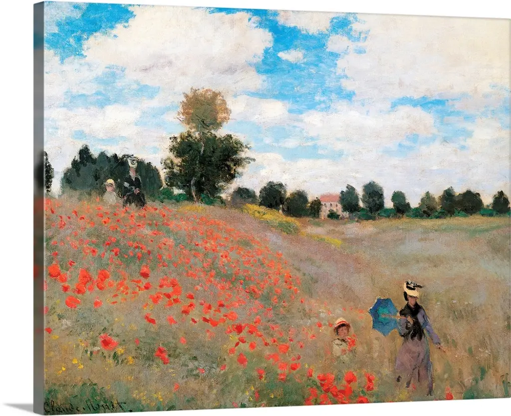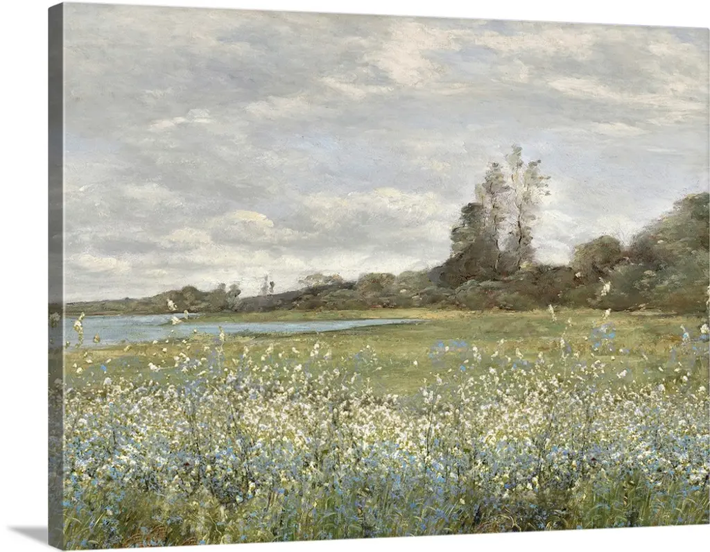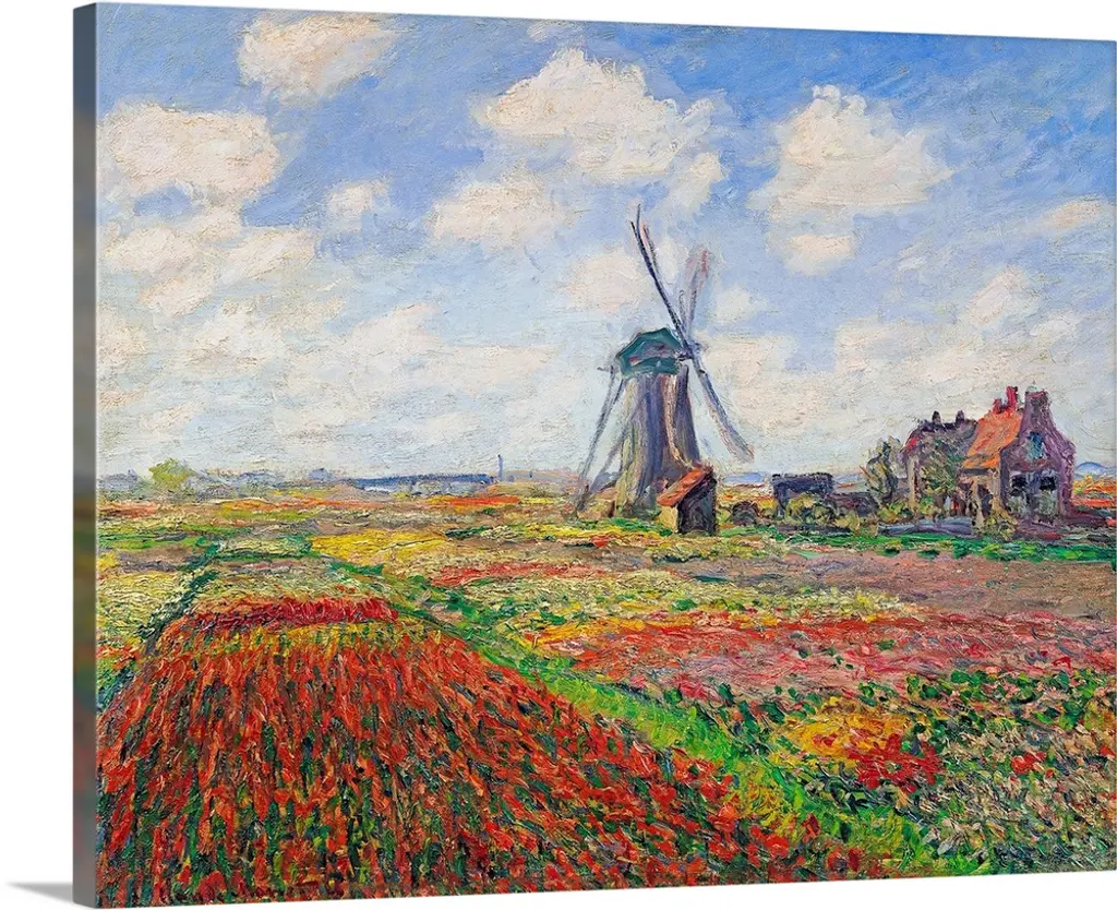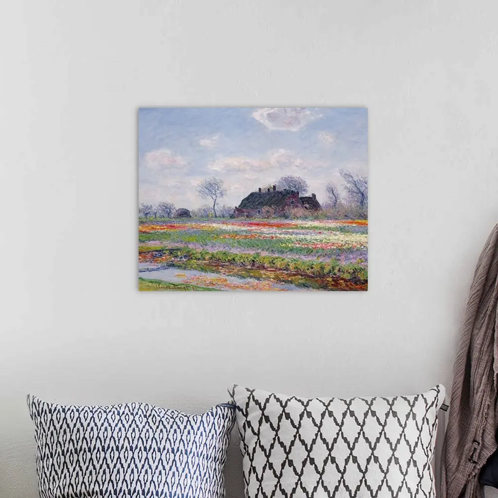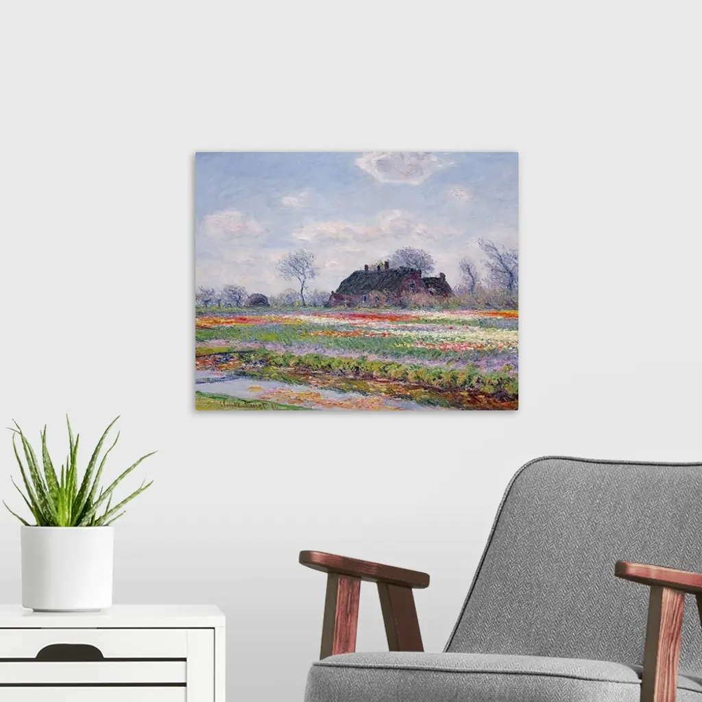 Huge classic art depicts a field in the Netherlands covered in an array of brightly covered flowers. Within the field is a lone house surrounded by bare trees scattered throughout the landscape.