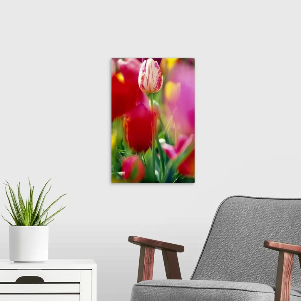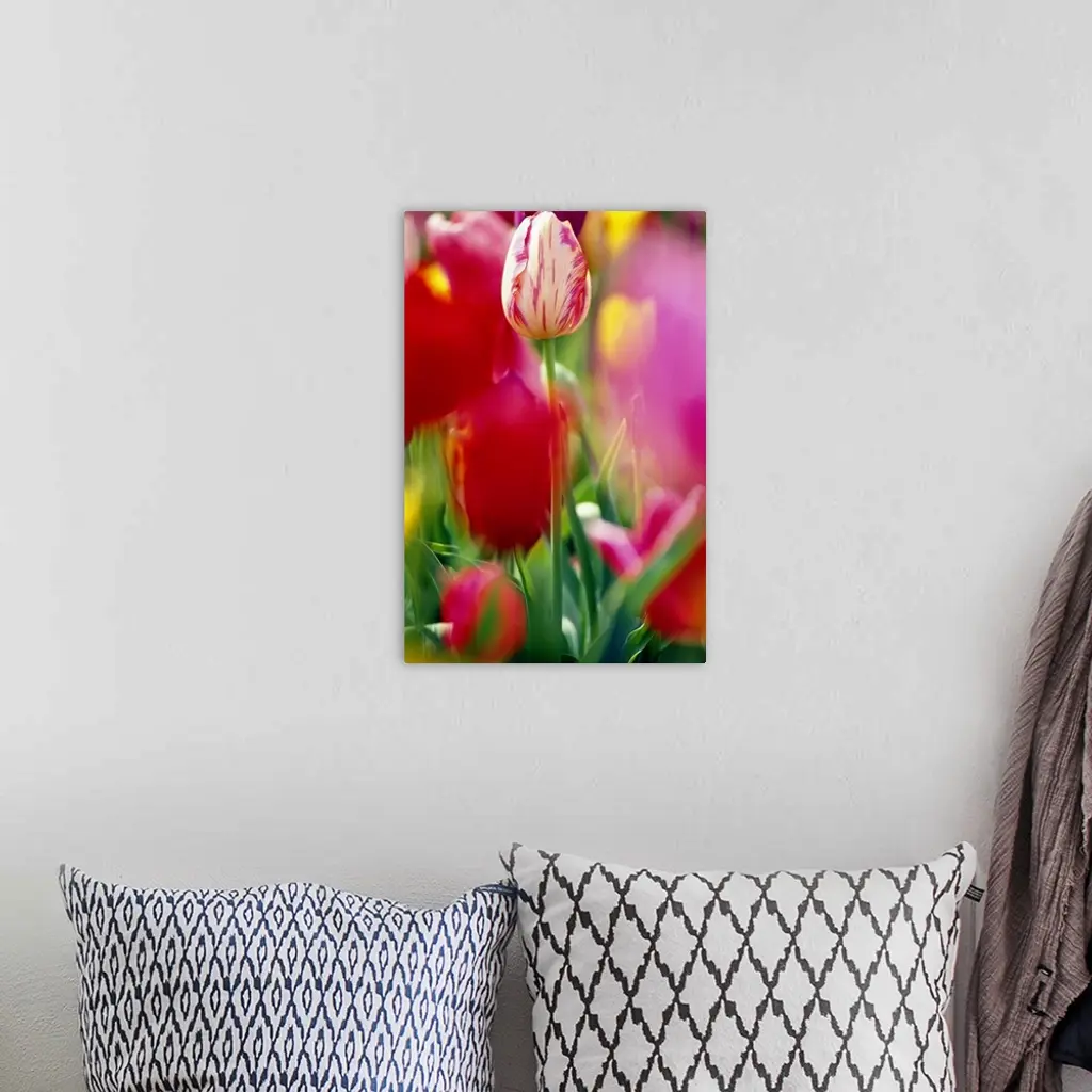 Portrait, close up photograph on a large wall hanging of a field of tulips, a center tulip in focus, the surrounding flowers and leaves slightly out of focus.