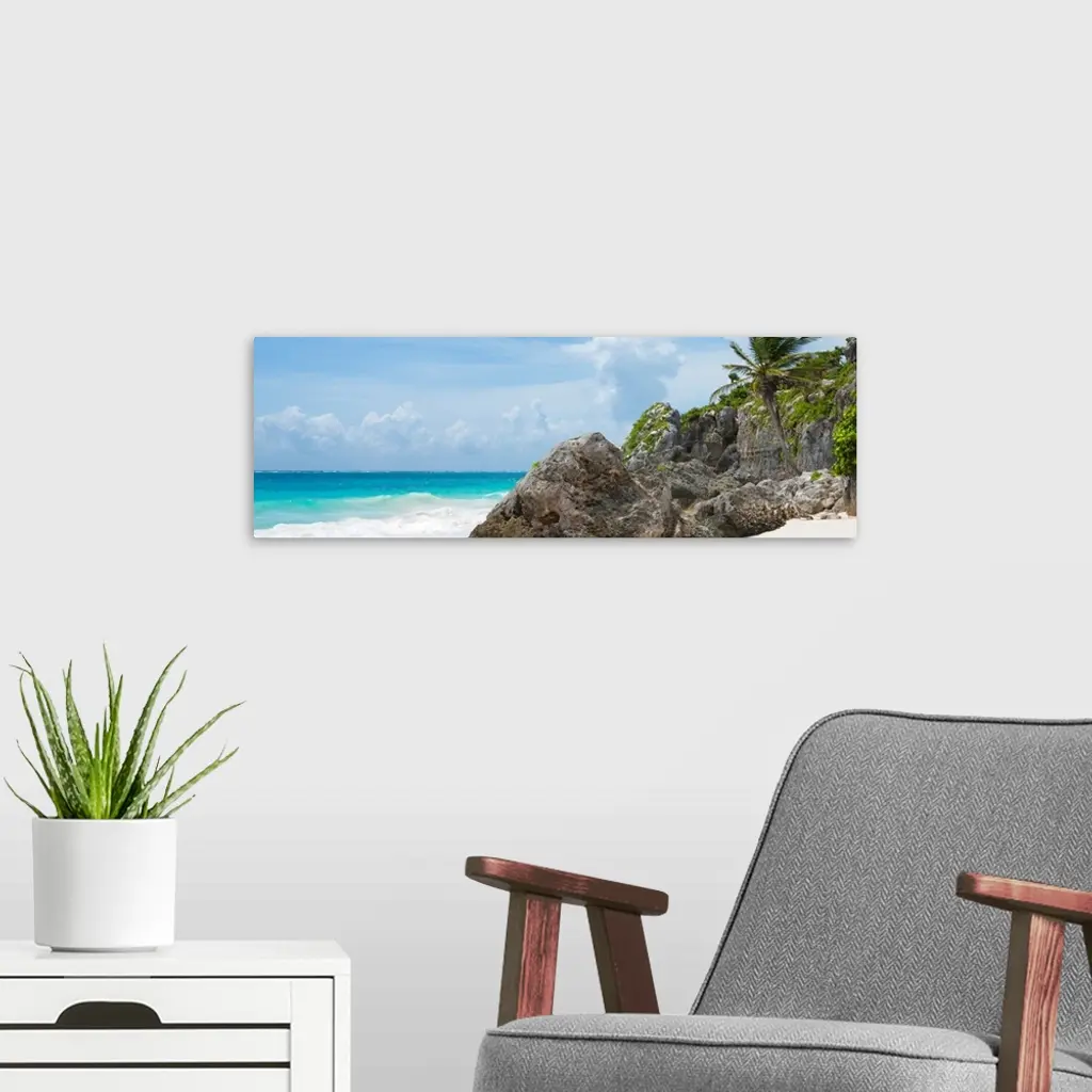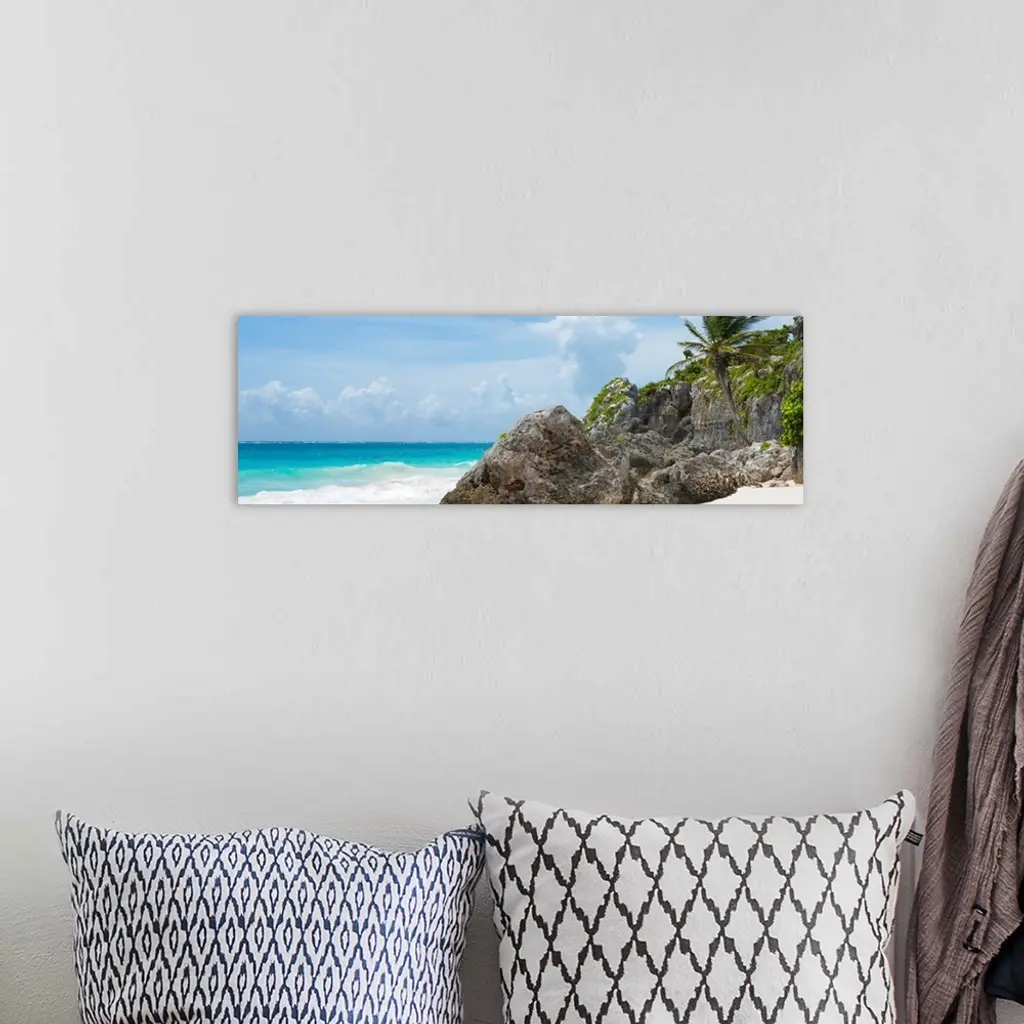 Panoramic photograph of a rocky Caribbean beach shore in Tulum, Mexico. From the Viva Mexico Panoramic Collection.