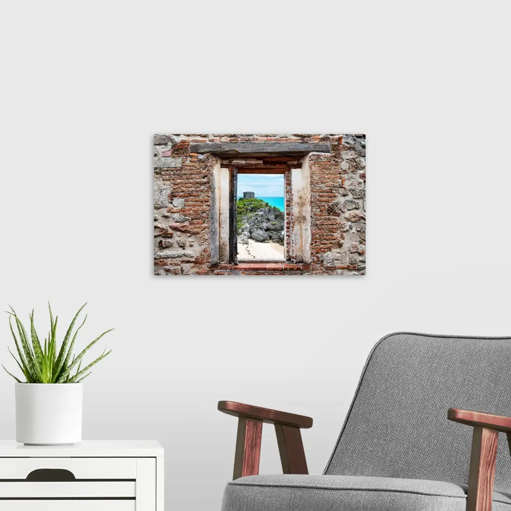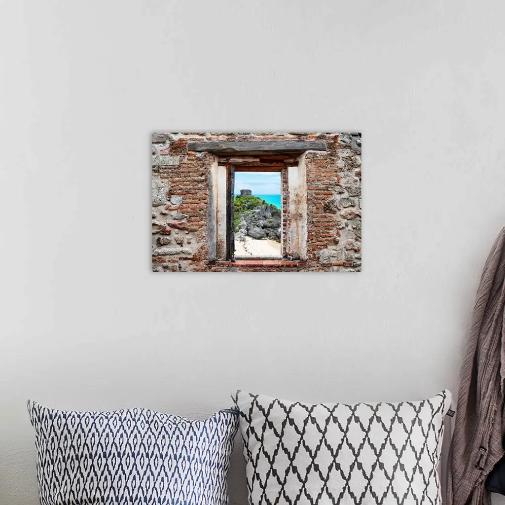 View of the Tulum Ruins, Mexico, framed through a stony, brick window. From the Viva Mexico Window View.