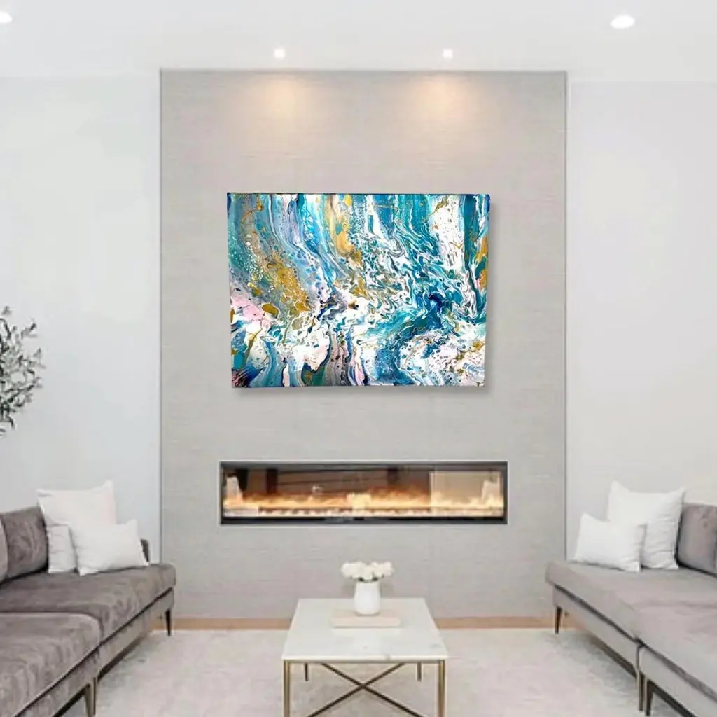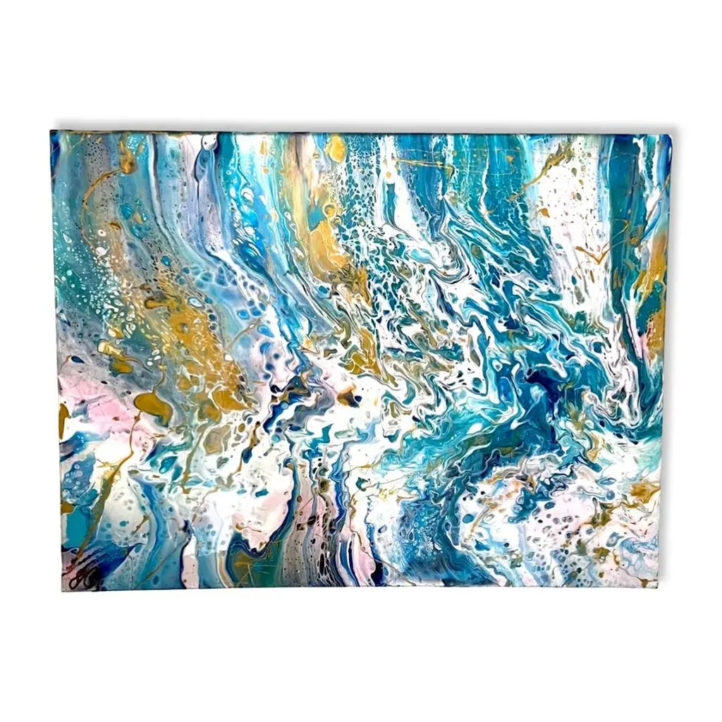 A Talitha-Anastasia Marco original, 'Tumultuous Trigg Tides', is a representation of one of Perth, Western Australia's most loved surfing destinations, Trigg Point. An often tumultuous and un-predictable tide, sees surfers battle the seas for the perfect wave. Trigg Point is not to be underestimated as Talitha represents in this art work, the rip-tides are strong and can pull one under in a blink of an eye. The clashing of two separated tidal pools in this piece, represent the many hidden tides throughout Trigg, with an uneasy and perhaps 'violent' display of turquoise darkened and pulled throughout the canvas. Subtle pink and violet hues are also melded in between the harsher blocks of turquoise seas, softening the sometimes unassuming calamity of the popular surfers destination. Painted on cotton canvas, with acrylic and oils, coated in glossy, glass like resin. The size of this product:Measures: Length: 101cmHeight: 76cmDepth: 4cm.