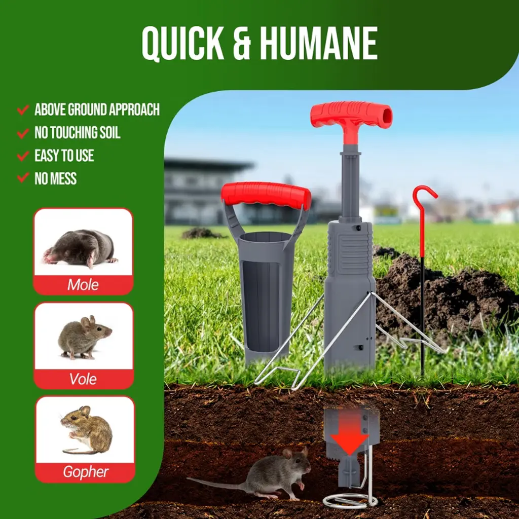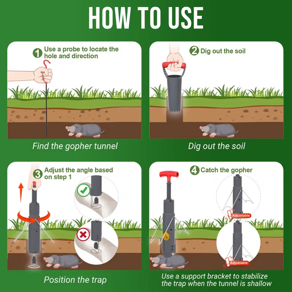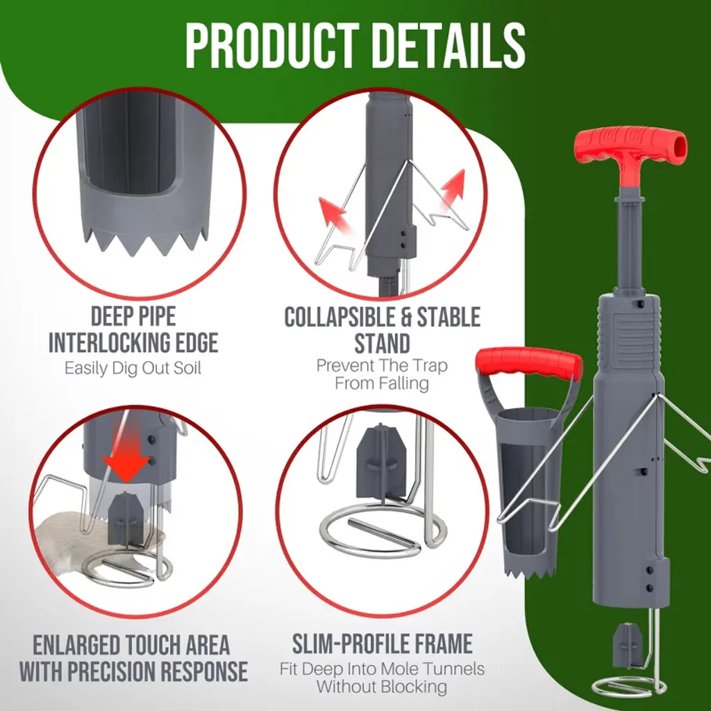 Easy Setup & Effective Trapping Locate the tunnel quickly using the included probe, then cut a clean vertical hole with the hole cutter. Simply insert the trap, extend the spring handle until it locks, and adjust the angle for optimal placement. For shallow tunnels, use the support bracket to keep the trap steady—ready to catch pests in seconds. Durable & Weatherproof Construction Built to last, this trap features sturdy plastic and rust-resistant stainless steel, making it ideal for outdoor use in lawns, gardens, and farms. The kit includes a digger, probe, and stand for precise tunnel targeting, easy soil removal, and stable placement—no tipping or misfires. Highly Sensitive, Yet Avoids False Triggers The enlarged trigger plate reacts instantly to mole movement but ignores loose dirt, thanks to its precision threshold. Paired with a high-tension spring and reinforced striking mechanism, it delivers a swift, humane capture with a near-perfect success rate. Smarter Design for Better Results Unlike bulky traps, our one-sided support design minimizes tunnel obstruction. Moles pass freely until activating the trigger—no suspicion, no escape. No bait required, just strategic placement for consistent catches. Versatile & Humane Pest Control Works effortlessly on gophers, voles, and moles. The push-pull mechanism ensures powerful spring action, while the capture indicator lets you check results at a glance. Perfect for homeowners and pros alike—reclaim your yard the easy way!